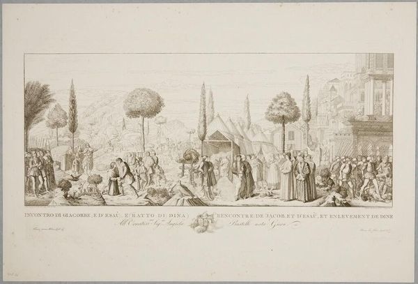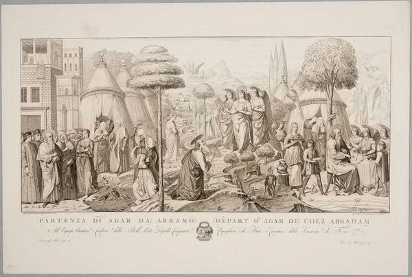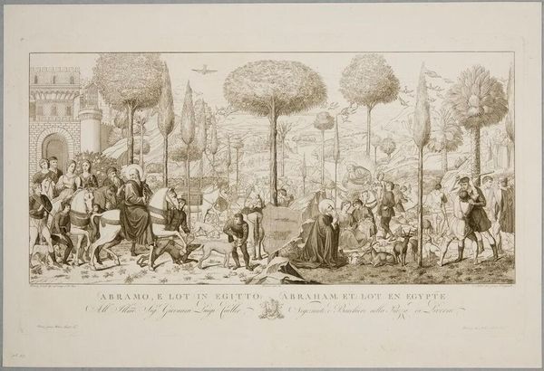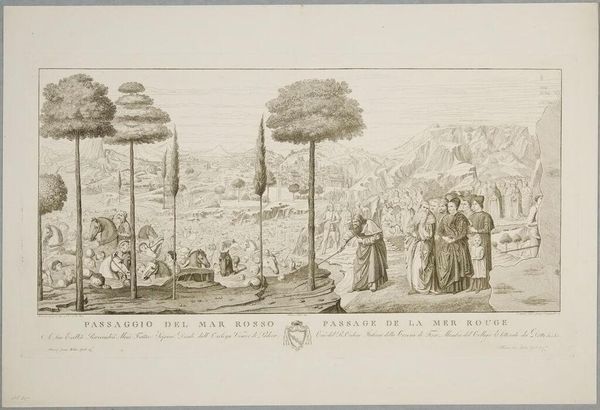 Editor: This is Carlo Lasinio’s "The Rod of Aaron, and the Brazen Serpent," a print held at the Harvard Art Museums. It's quite detailed, but the linear style almost feels like a stage set with all these figures. What can you tell me about its context? Curator: Consider the moment of its creation. Prints like this circulated widely, shaping public understanding of biblical narratives. The formal style echoes classical ideals, lending authority to the scene, but notice how it also flattens the space. Does this affect your interpretation? Editor: I see what you mean. It's like the artist is trying to make it feel both grand and accessible. So the style itself is a commentary? Curator: Exactly. The print’s public role, disseminating religious stories, is inseparable from its artistic choices. Reflect on how such imagery influences belief and social order. Editor: That gives me a lot to think about. Thanks, I’m going to look into how the distribution of prints shaped religious and political views at that time.