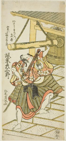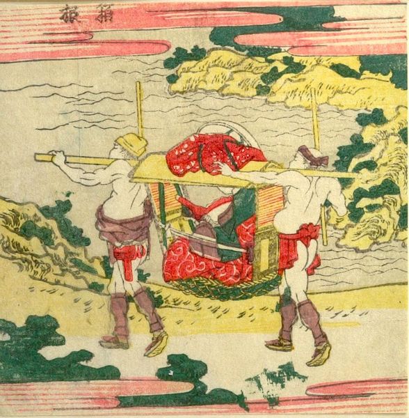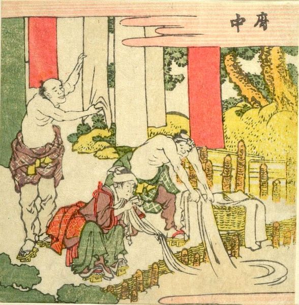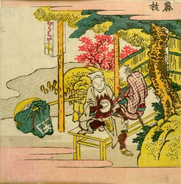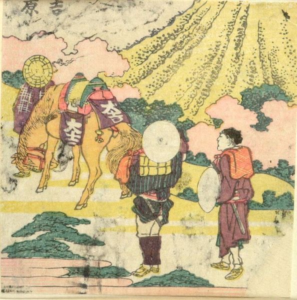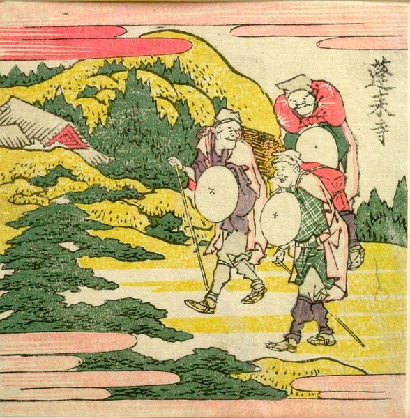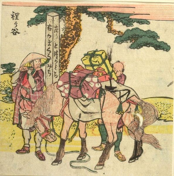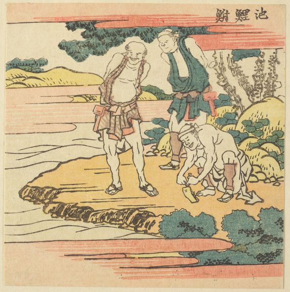 Editor: So, this small woodblock print by Hokusai, "Man Attempting to Lift the 'Tiger Stone'," feels so grounded, despite the comical expressions. What do you see in this piece? Curator: I see a commentary on labor and the performance of masculinity. This image, part of a series on the TÅkaidÅ road, highlights the experience of ordinary people. Is the tiger stone a symbol of the burdens they carry? Editor: Possibly! The title certainly directs our reading. I didn't think about burdens at first. Curator: How might class and gender inform their struggle and the expressions that convey their efforts? Editor: Hmm, I am not sure, I'll have to think about that. Thanks! Curator: Indeed, and considering Hokusai's own challenges, it adds another layer. Let's both think about it.