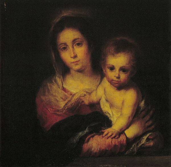 Curator: We’re looking at “Mrs. Benjamin West and Her Son Raphael,” a painting made in 1767 by Benjamin West, likely oil on canvas. It’s currently in a private collection. Editor: My immediate reaction is how classical the composition is—it feels almost like a Madonna and Child, yet grounded in this very earthly materiality. Curator: Indeed. West was consciously elevating his family to this level of historical and almost religious importance. Notice how he’s situated them within the tradition of grand manner portraiture, a style favored by the elite and meant to convey dignity, status, and refinement. Editor: And yet, there’s a compelling focus on the textiles: the way the light catches the folds of her headscarf, the swaddling cloth around the child. You can almost feel the texture of the materials themselves, a testament to the artist’s craft and, dare I say, Mrs. West’s role in acquiring and caring for these possessions. Curator: Precisely. Consider also West's position within the art world at this time. As a co-founder of the Royal Academy, he was instrumental in shaping the public perception and instruction of art in Britain. Paintings like these solidified his reputation, shaping ideals of motherhood and family within a broader cultural context. Editor: Right, and let’s not forget the material implications of that status. Pigments, canvas, the very act of commissioning a portrait like this—these speak volumes about the social stratification and consumption of art in the 18th century. Was West consciously reflecting this material reality? Curator: I think West, like many artists of his time, was interested in constructing narratives that were both aesthetically pleasing and socially resonant. This portrait certainly romanticizes motherhood, but it also functions as a historical document, showcasing the West family's position and taste within the burgeoning British empire. Editor: It's a delicate balance, isn't it? To imbue everyday subjects with classical weight while simultaneously reminding us of the tangible, earthly elements that underpin such representations. You get a feeling about how those cloths looked. Curator: Absolutely. By bridging the personal and the historical, the ordinary and the ideal, this portrait continues to fascinate and prompt new questions. Editor: Yes, it encourages a multilayered investigation into a formative period of material culture, challenging simplistic labels of both the "historical" and the "domestic."