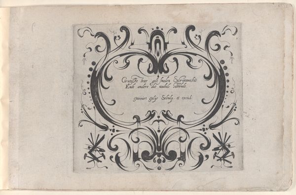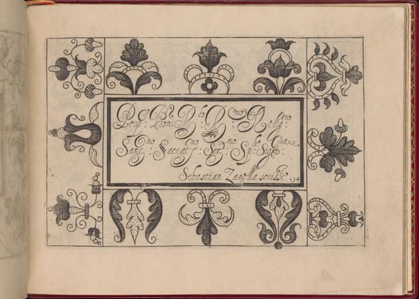 Editor: This is a page from "Ghirlanda: Di sei vaghi fiori scielti da piu famosi Giardini d'Italia" created in 1604. It’s attributed to Pietro Paulo Tozzi. The artwork incorporates drawing and print media. The delicate line work forming floral patterns, coupled with calligraphic script, create an intricate framed design. What strikes me is how contained and structured it is. How do you approach interpreting a work so focused on precision and order? Curator: The composition relies heavily on symmetry and repetition. Notice how the floral motifs are mirrored across the vertical axis and repeated along the borders. The inscription is centered and contained within a rectangular frame. It is evident the artist sought balance and formal clarity. What purpose might this attention to structure serve, considering the work's function as a page in a book of flower drawings? Editor: Perhaps to elevate the simple study of flowers to something more refined and precious? The flowers themselves become almost secondary to the overall design. Curator: Precisely. The linear quality dominates, and the delicate inkwork becomes an exercise in pure form. Observe the subtle variations in line thickness; this creates depth and visual interest despite the limited tonal range. What does this suggest about the artist’s priorities? Editor: That he valued precision and technique? Almost as if the act of drawing, the manipulation of line itself, was the primary subject? Curator: An astute observation. By analyzing the intrinsic qualities of the artwork – its line, form, and composition – we can appreciate the artist's intention to showcase not only the beauty of flowers but the beauty of structured design itself. Editor: This close examination of the artwork's formal elements really opened my eyes to the beauty in its structured design! Curator: Indeed. The rigor and precision is certainly noteworthy!