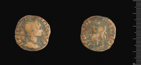 Curator: This is an "As" coin of Maximian, currently held at the Harvard Art Museums. The production of such coins speaks volumes about imperial administration. Editor: It's a humble object really, but you can sense the weight of the Roman Empire within it. Curator: Precisely. The material, likely bronze or copper, tells us about the economic systems in place, the mines exploited, and the labor involved in its creation. Was it local or imperial production? Editor: Beyond that, it's a portable form of propaganda, isn't it? Each one carrying an image of power and authority into everyday transactions. Curator: Absolutely. The iconography reflects the emperor's attempt to legitimize rule. The coin's circulation reinforced the empire’s socio-political order. Editor: It's fascinating how such a small object embodies so many complex systems. Curator: Indeed. A testament to how material culture shapes history.
