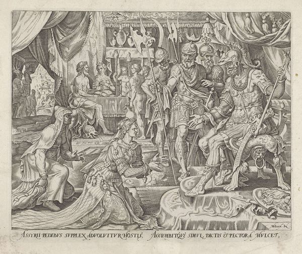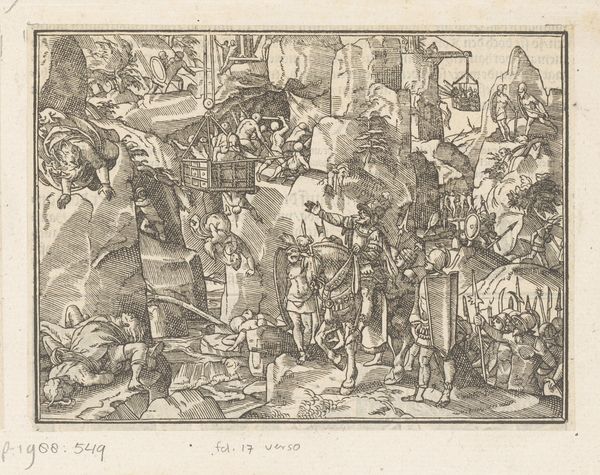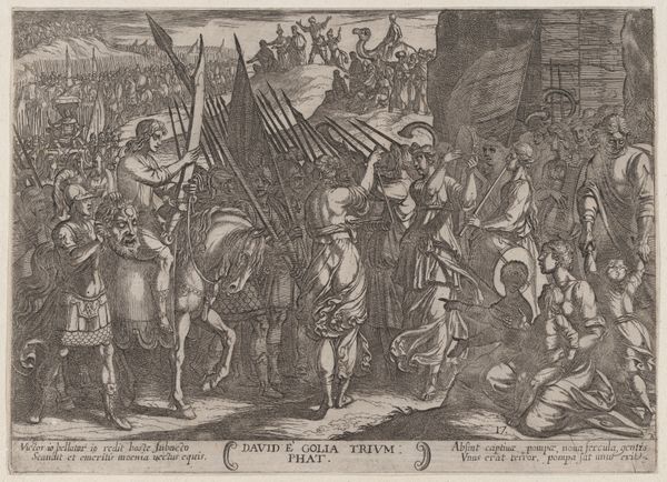 Curator: This etching by Antonio Tempesta, dating somewhere between 1565 and 1630, depicts a scene from Tasso's "Gerusalemme Liberata," specifically illustrating Canto XII. What strikes you most when you first see it? Editor: Honestly, it feels like a fever dream transcribed onto paper. The sheer density of figures, the swirling action… there's a restless energy to it. Almost overwhelming. Curator: It is rather packed, isn’t it? Tempesta, known for his battle scenes and historical narratives, certainly crams a lot into this composition. Technically, it’s a marvel. Look at the way he uses line variation to suggest depth, guiding our eye from the foreground figures to the distant siege. Editor: The foreground is definitely where the drama is. All this grieving over a fallen warrior… who are these characters? Is that their war horse looking forlorn in the corner? I love how expressive the horse is - its face seems genuinely sad! Curator: The poem tells the story of the First Crusade, so you're witnessing a scene of profound mourning amidst the ongoing conflict. That's Tancredi and his slain love Clorinda. Tempesta captured their intense love, loss and sacrifice here using sharp and expressive contour lines and dramatic contrasts. It creates a very palpable atmosphere of devastation, wouldn’t you agree? Editor: Absolutely devastating. There is such pathos in these kneeling, almost prostrating men - that speaks to their great vulnerability as a community and also the sense of heroism surrounding this fallen soldier. But does the chaotic composition somehow detract from the individual emotional impact of the characters here? Curator: Perhaps. It definitely makes the viewer work harder to engage with the key elements in this story of tragic romance in such a complex historical scene. But the detail also reinforces the poem's broader exploration of war's devastating reach. Editor: Ultimately, Tempesta gives you the sweep of a history painting combined with these deeply affecting figures. An ambitious artistic exploration of literature, love, and war all together. I’d say it all melds together really beautifully! Curator: A moving example of history remembered. It makes you think doesn’t it?