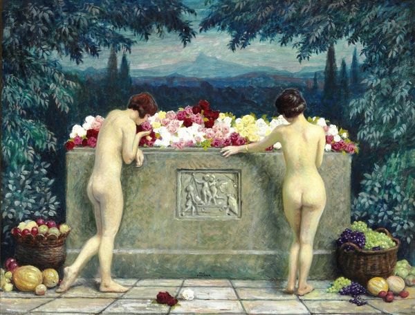 Editor: This is Frantisek Kupka's "Autumn Sun, Three Goddesses," painted in 1906 with oil paint. There’s a striking vulnerability in the poses of these figures. What strikes me most is how they seem caught between classical ideals and a very real, embodied existence. How do you interpret this work? Curator: What I see here is Kupka engaging in a fascinating dialogue with tradition. The classical trope of the Three Graces, of course, immediately springs to mind, but filtered through a decidedly modern lens. We should consider how this painting reflects the socio-political context of its time, specifically the burgeoning feminist movements challenging conventional representations of the female body. How might we understand the figures' non-idealized bodies as a quiet act of resistance? Editor: So, the painting challenges conventional beauty standards, perhaps even making a statement about body positivity, especially considering the time it was painted. But doesn’t the nude form in art also carry a complicated history, particularly in terms of the male gaze? Curator: Precisely! The nude form is rarely neutral. While Kupka could be interpreted as subverting idealized beauty, we must also be critical about how the female nude has historically functioned within a patriarchal system. Where does the artist's intention intersect with the viewer's interpretation and pre-existing cultural biases? Think about the Symbolist movement to which Kupka belonged; it explored subconscious desires, anxieties, and gender dynamics through dreamlike imagery. Editor: That's such a complex lens through which to view it. So, beyond the surface-level beauty, Kupka uses symbolism to make a nuanced comment on the changing status and representation of women. Curator: Exactly! It’s a potent example of how art can both reflect and challenge the prevailing norms of its time, urging us to critically examine the narratives embedded within seemingly classical forms. Editor: I see so many more layers now; thank you!