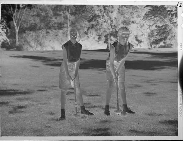 Editor: So, this is an untitled photograph by John Howell, depicting a woman with two boys outside. It has a somewhat eerie feel because it looks like a negative. What do you see in this piece? Curator: It reminds me of old family albums, ghosts caught in time. The inverted tones make it dreamlike, but also vulnerable. It makes me wonder about the untold stories held within ordinary moments. What do you think that the artist was aiming to capture? Editor: I'm not sure, maybe the beauty in the everyday. Thanks, that was insightful! Curator: My pleasure. It's a beautiful piece to ponder.