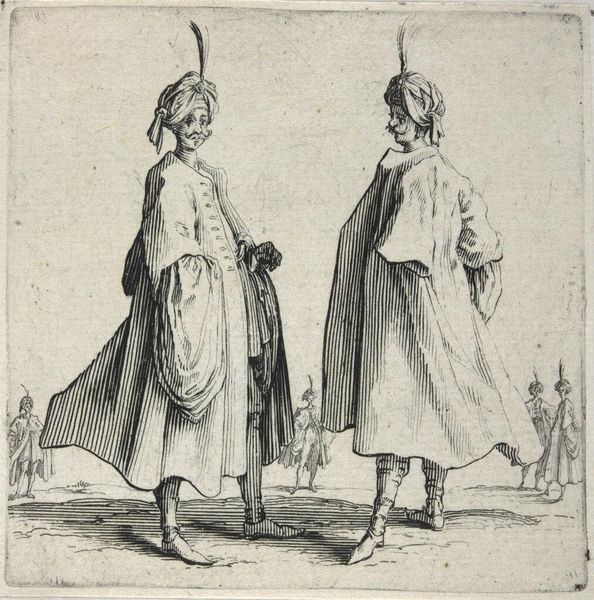 Editor: This etching, "Man with a Large Cloak, Seen from the Back" by Jacques Callot, is striking, yet I'm unsure what to make of the two figures looming in the foreground. What should viewers consider when interpreting this work? Curator: Look closely at their cloaks, their size and how they obscure the background figures. Consider how clothing functions as a marker of identity and status. Callot is inviting us to consider how these men might be asserting dominance through their attire. Editor: So the focus isn't just on aesthetic, but social commentary? Curator: Exactly. What does it mean to literally overshadow others? Think about how power dynamics are visually represented, and who gets to occupy space, both physically and socially. Editor: It makes me rethink the role of fashion in historical contexts. Thanks for sharing your perspective. Curator: And thank you for engaging with the work! It reveals how even seemingly simple images can prompt complex questions about social structures.