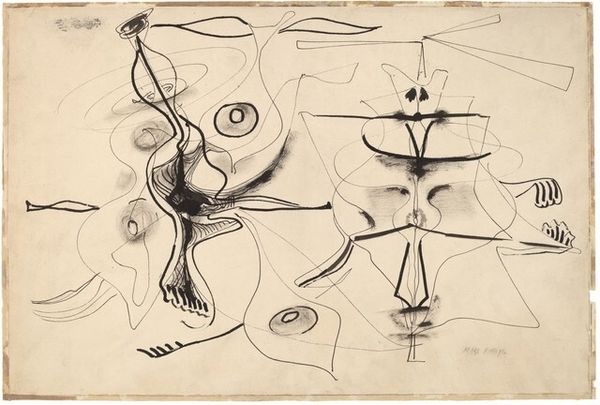 Curator: Ah, yes. "The Family," a 1924 drawing by Joan Miró, currently residing here at MoMA. Executed in ink on paper, it presents a whimsical world of abstract figures and geometric forms. What leaps out at you? Editor: Chaos, delightful chaos. It's like peeking into a mathematician's dream after they've indulged in a bit too much absinthe. Shapes collide, lines dance… it feels very subconscious, you know? Are we sure he didn't have a playful poltergeist guiding his hand? Curator: Well, the influence of Surrealism is quite apparent, and Miró was, after all, exploring the depths of his unconscious. He wanted to dismantle the conventional idea of representation and tap into a more primal mode of seeing. You see the hints of figuration struggling to emerge, fighting against abstraction. It speaks to the era, the unease and reinvention following the First World War. Editor: It's a total re-imagining, isn't it? A family portrayed not in flesh and blood but as a constellation of symbols and suggestive shapes. Is that supposed to be an eye in that little box, staring back at the viewer or perhaps inward towards itself? Curator: Precisely! The eye as a symbol of perception, introspection, the act of seeing itself. And note the overall muted palette, almost sepia-toned. The restrained use of color directs our attention to the intricate linework and the interplay of shapes. How does this…family make you feel, overall? Editor: Strangely enough, safe. Despite the seemingly random nature of the forms, there is something deeply harmonious in its design, each little figure interconnected like elements of music. There's even a hand holding another character; that feels intentional. Curator: Perhaps representing tenderness. Even in its most abstracted form, familial connection persists, that invisible string binding these characters. I find the overall composition deceptively structured too. It gives order to the chaotic, doesn't it? A comforting sentiment during unsettling times. Editor: Absolutely. It's organized spontaneity, beautifully controlled. This drawing provides us with the playful framework, and our interpretation completes the work. Thanks for letting me express some impressions; there's more here than one first imagines. Curator: And thanks to you for your thoughts; that's the power of Miro's art to spark conversation and free association even now, almost a century later. It reminds us of the importance of experimentation.