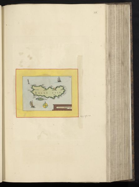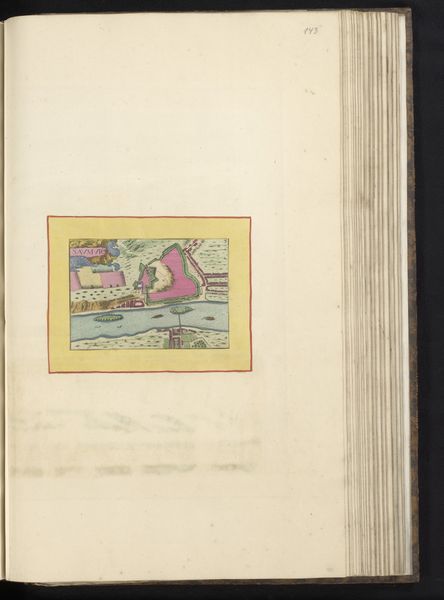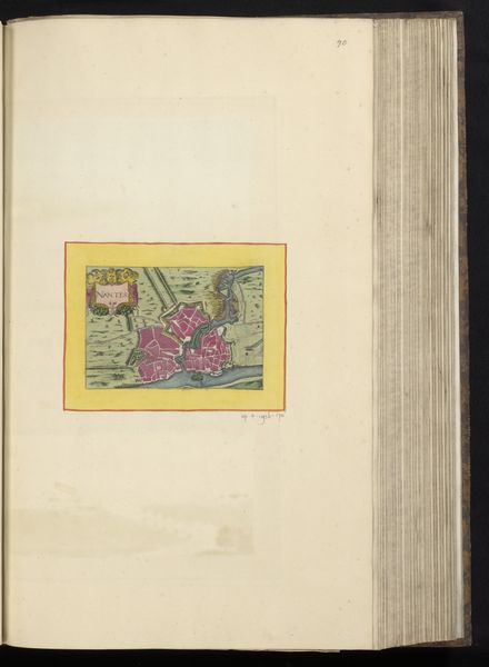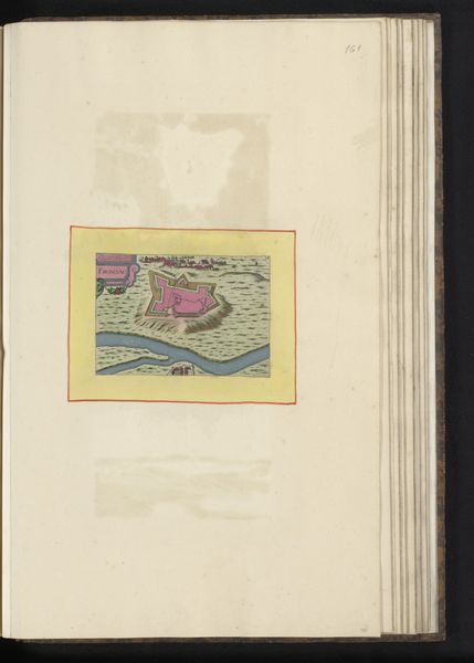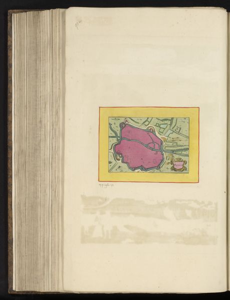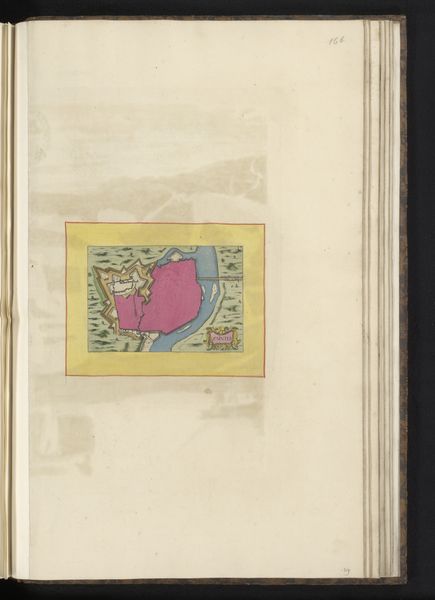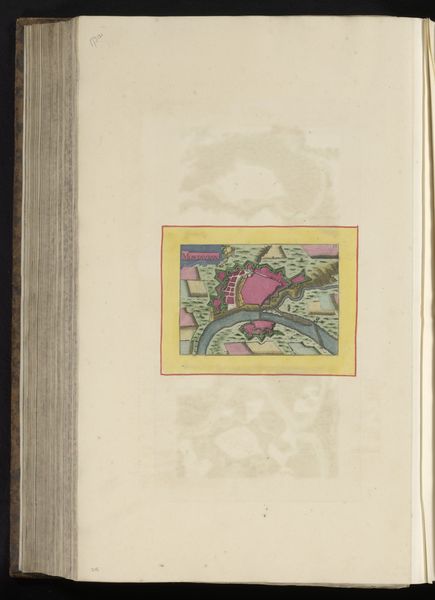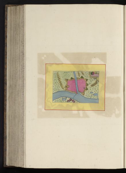 Editor: Here we have an anonymous, early Renaissance drawing titled "Vestingplattegrond van Angoulême" from 1638, created with ink and watercolor on paper. It depicts a city map, almost bird's-eye view, and the pink city within the bright yellow border stands out immediately. What symbolic weight might a fortified city, rendered this way, have held in the cultural imagination of the time? Curator: Indeed, a visual representation of power, certainly, but much more. The pink itself is quite interesting; it is the color of authority blended with…vulnerability. And maps, you see, they’re not just about geographical precision. How do they make you feel? What memories or ideas do they evoke? Editor: I think there's a feeling of control… almost like I could move things around as the viewer. But it’s static, all defense, little life. Curator: Precisely! Maps project human dominance over space. The ‘Vestingplattegrond’ presents Angoulême not just as a place, but as an idea of strategic and civic strength, preserved on the page. And the careful details… are there elements you find particularly interesting? Editor: I noticed the waterways snaking around it, and I imagine they are defensive elements. Water often stands for renewal, but here… Curator: Yes, water, here rendered with such care, visually hems the city in, protecting it. It could mean many things, from purification, or in the Jungian sense, even the collective unconcious surrounding Angoulême. Ultimately, the map doesn't simply document; it attempts to manage perception, presenting a carefully curated vision of a city confident in its defenses, and perhaps, itself. Editor: I never would have considered the psychological aspects of city planning through something like a map! Thank you. Curator: My pleasure! The symbols whisper stories to those who listen closely.