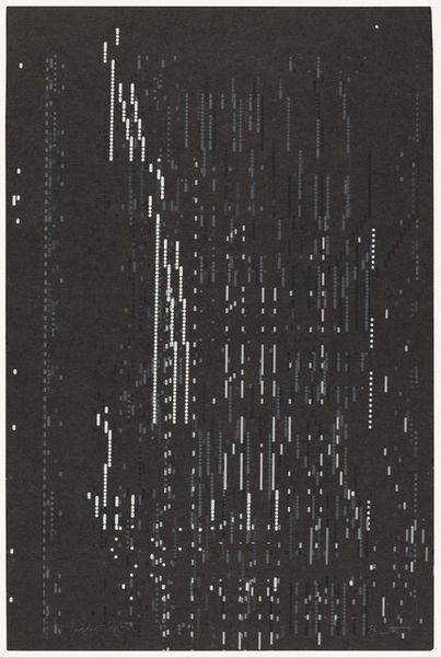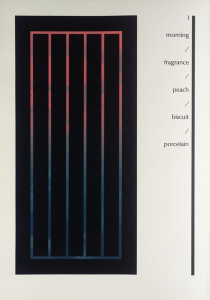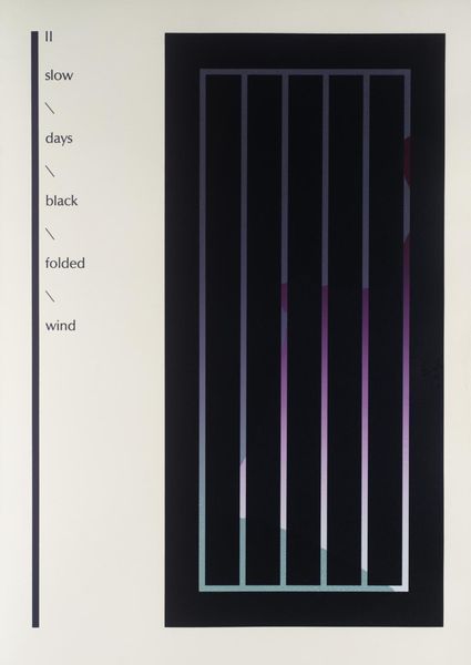 Editor: This is "IV" by Ian Tyson, from the Tate collection. The stark lines and contrasting text really draw the eye. What cultural narratives do you think Tyson is engaging with here? Curator: Well, the text, "curled fronds bruised purple lip", juxtaposed with the geometric abstraction suggests a deliberate disruption of artistic expectations. How do you see that tension functioning within the broader art world? Editor: It makes me wonder if Tyson is critiquing the commodification of nature through sterile forms. Curator: Precisely. The controlled lines versus the organic text hints at the institutional framing of art, doesn't it? It invites us to question the systems that define artistic value. Editor: I see! So, it's not just about the art itself, but about the context it exists within. Curator: Exactly, and how galleries and museums contribute to that context. The artwork becomes a form of social commentary. Editor: This piece gives me so much to think about in terms of art's role in society. Curator: Absolutely, it encourages us to consider the political implications of imagery and presentation.
