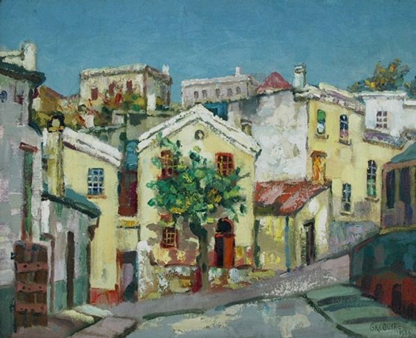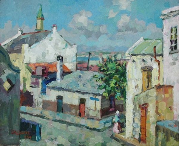 Gregoire Boonzaier’s ‘District Six with view to harbour’ is a painting made with oil paint, that seems to delight in the materiality of the medium. The paint here is thick, almost sculptural in places, particularly where he renders the buildings on either side of the street. Look closely and you’ll see how he uses loaded brushstrokes to suggest the rough texture of the walls. The colours are muted, a mix of earthy tones and grays, with a few pops of brighter colour, like the red roofs and the blue of the harbour in the distance, this adds depth and helps to create a sense of atmosphere. I love how Boonzaier captures the energy of the street scene, people milling about, the buildings leaning in, the scene is imbued with a feeling of everyday life, a sense of place. There’s a real connection with the work of the French Impressionists and Post-Impressionists, but Boonzaier brings his own South African sensibility to it, creating a unique and powerful image. It’s a painting that invites you to linger, to explore, and to imagine the lives of the people who once called this place home.