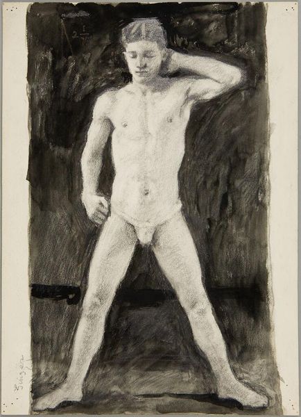 Editor: Okay, so this is Picasso's "Nude Youth" from 1906, an oil on canvas. It's surprisingly…rough. Almost unfinished, but the texture of the paint and the sketch-like quality gives it a raw, immediate feel. How should we interpret it? Curator: Focusing on materiality, notice the canvas itself. It's not primed to perfection, allowing the paint to interact directly, creating these earthy tones. Look at the pigments - ochres and browns. These weren’t randomly chosen; they’re commercially available earth pigments. Picasso is consciously choosing these accessible materials. Why do you think that is? Editor: Maybe to democratize the process? Like making it more about skill and less about fancy supplies? Curator: Precisely. Also consider, he's painting a "nude," a subject historically associated with academic art and often the patronage of wealthy individuals. But the way he uses materials is, dare I say, proletarian. What statement might Picasso be making about the role of art and artist? Editor: He's using humble materials to elevate an everyday subject, a nude yes, but also a normal-looking young man rather than a mythological figure. This elevates the mundane through the *process* of painting itself. Curator: Exactly! The brushstrokes are visible, the layering is evident – it's less about illusion and more about the act of creating an image. He lays bare the labour involved. How does that connect to the art market, perhaps? Editor: By revealing the "work," he perhaps diminishes the aura of untouchable genius, reminding us of the physical effort of making art. Curator: Precisely! And perhaps questions the value system inherent in a market that fetishizes the finished product. Editor: That’s fascinating. I'd never considered Picasso's material choices as a deliberate challenge to the established art world. Curator: Understanding the "how" – the materials, the processes, the labor – brings us closer to the "why" of art. This is more than just a nude study, it is a statement using humble art-making process.