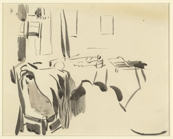 Editor: So, here we have "Interior with a Woman Cutting Cloth for a Costume" from 1915 by Rik Wouters. It's a pen and ink drawing that has a certain...domesticity to it, a real slice of life. The flurry of the linework gives it this bustling energy. What do you see in this piece? Curator: You've already picked up on its intimacy, its 'intimism', one might say. I am drawn to the dance between the flatness of the page and the illusion of depth that Wouters creates with just line and shadow. It's as though we’ve caught a glimpse into his world, wouldn’t you agree? Notice the birdcage; the glimpse through the window. What do those elements suggest to you? Editor: It feels like she's surrounded by these little contained worlds...the birdcage, the room itself. Maybe a comment on women's roles at the time? Confined to the domestic sphere? Curator: Perhaps. Or maybe, it's about finding beauty and inspiration within the everyday, the contained. I often wonder if he sees the interior *as* a kind of costume, enveloping and shaping the lives within it. Don't you find something rather theatrical about the composition itself? Editor: That's a fun idea, the interior as a costume! It does have a staged quality. Like we're watching a play, and she's preparing for her role. Curator: Exactly! It's a moment suspended, captured with a kind of affectionate quickness. And I always find it fascinating to consider how much of Wouters' personal life found its way into his art... a little window into the window! Editor: I didn’t think about it that way, it definitely changes how I appreciate the drawing. All these hidden windows… I might be ready to re-write my thesis! Curator: Oh, delightful. The greatest art sends us spinning into uncharted territory.