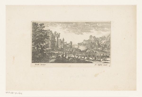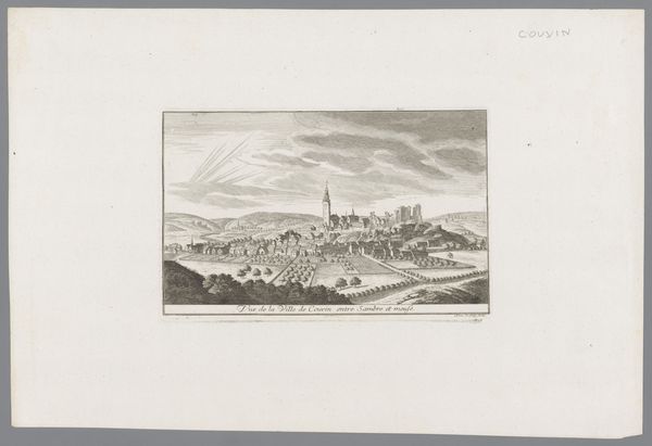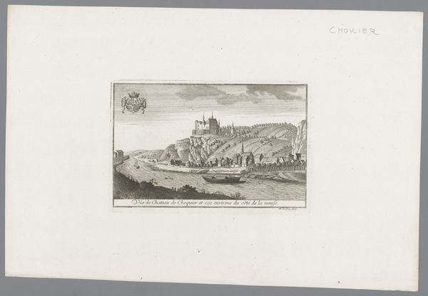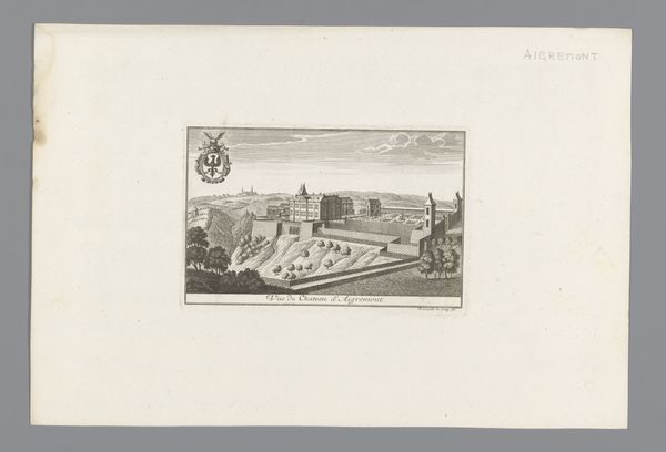 Curator: Here we have an intriguing piece—a baroque engraving titled "Gezicht op het kasteel te Ampsin," or "View of the castle at Ampsin," dating from about 1738 to 1744. It is created by an anonymous artist. Editor: It certainly captures a certain formality of the era. The careful hatching to create the tones is amazing. What jumps out at me, though, is how much this is about controlling nature. Curator: Absolutely. The composition emphasizes human dominion over the landscape, but I am compelled by the materials used. The fine lines achieved through engraving demonstrate exceptional skill and craftsmanship in printmaking traditions of the 18th century. You can also tell that this print was reproduced so that it could reach more eyes than if it were an original drawing or painting. Editor: Agreed, engravings allowed for broader circulation, shaping public perception of places like Ampsin and the cultural importance of castles. I wonder, what would people use these images for? To showcase wealth? Validate status? It speaks to power, the castle on the hilltop surveyed by common people. Curator: Perhaps all of the above. The engraving, beyond being an artistic object, is a testament to the material conditions of its time. This required specialized tools and training, reflecting a particular socio-economic structure of artistic production. Editor: Yes, how the work functions and who it was for interests me, but I cannot deny the pleasure derived from just gazing upon it. I love the light contrasted against shadow. It is idyllic. Curator: In closing, it allows us to see art as an intersection of intention and historical context. Editor: Indeed. Viewing a single print, like this view of Ampsin, provides layers for deeper social questions about class, influence and representation.