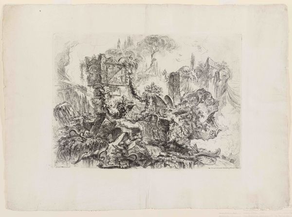 Giovanni Battista Piranesi created this print, "Decorative Capriccio with the Triumphal Arch", using etching, a printmaking technique in which a metal plate is coated with a waxy ground, into which the artist scratches an image. The plate is then dipped in acid, which bites into the exposed metal, creating lines that hold ink. The resulting print is a study in contrasts. The crisp precision of the etched lines captures the ruinous architectural elements, while the softness of the paper lends an ethereal quality to the scene. The heavy, textured foreground and the hazy background create a captivating sense of depth. Piranesi skillfully employed labor-intensive techniques to create this artwork, a demonstration of the engraver's art at a time when such skills were highly valued. By celebrating craft and materiality, Piranesi elevated printmaking from a mere reproductive medium to a form of artistic expression in its own right. It is a celebration of the handmade in an increasingly industrialized world.