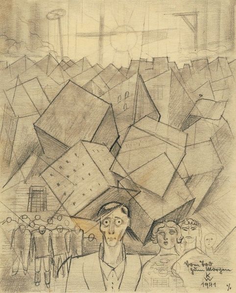 Karl Wiener made this drawing titled 'Aus Trümmern erhebt sich der Mensch' in 1942, and it feels like he made it tentatively, as if he's feeling his way forward. The texture is built from many short lines, forming planes with subtle tonal variations. It's so architectural, he's using the pencil almost like a construction tool. I love the top of the rubble heap, how it becomes a flat platform where the figure stands. The man himself is so stolid, so upright, despite everything that’s happened. There’s a real tension between fragility and strength in this drawing, and it reminds me of some of those early Cubist paintings by Picasso and Braque, but with an added layer of emotion, as if Wiener is trying to find a new way of seeing after everything has been broken apart. It's less about destruction and more about reconstruction. The drawing feels like a conversation, not just with other artists, but with the future.