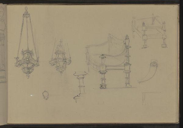 Curator: Here we have a page from a sketchbook, "Studieblad, onder andere met het exterieur van een kerk en monstransen," by Pierre Joseph Hubert Cuypers, dating from 1837 to 1921. The medium is pencil on paper. What strikes you first about this drawing? Editor: An immediate sense of transience, these quick sketches convey ideas captured rapidly before they fade. The light pencil on aged paper feels ephemeral. Curator: Precisely. Consider Cuypers’ process here. The material evidence of design: tentative lines mapping out church exteriors alongside meticulous studies of monstrances, key objects within Catholic ritual, showcasing metalwork, adornment and skilled craftsmanship. Editor: Yes, and the juxtaposition of architectural forms with these religious objects is quite potent. The monstrances, especially, are laden with symbolism. Each cross, each decorative flourish, carries the weight of centuries of Christian iconography and the memory and the meditation of death through those little skull details on two of them. Curator: Good eye. It points toward the function of these objects and buildings. Were they not mere aesthetics of labor and construction? They exist to serve ritual and the expression of collective faith, shaping societal behaviours. The sketchbook becomes a workshop of religious culture. Editor: Indeed. These weren’t just metal objects, they were focal points for community worship, for articulating identity, maybe, a relationship to transcendence through their shared experience in and out of gothic interiors. Cuypers is mapping the visual vocabulary of faith. Curator: A visual vocabulary rooted in precise labor, from the mining of materials to the goldsmith's art. Think of the guilds, the apprenticeship model, the knowledge embedded in these production practices and its importance in shaping material reality of Dutch society in the late 19th century. Editor: The object serves as a mirror reflecting their values back at them. Studying this piece brings awareness to both its function, meaning and materiality to our attention. Curator: Looking at this seemingly humble sketchbook page has given me a better understanding of not only how Cuypers developed his ideas, but of the skilled and faithful world that helped shaped it, one process at a time. Editor: It shows us a rich visual legacy that still informs and resonates. The cross-cultural exchange of iconographies and artistic craftsmanship across Dutch culture, which opens new doors for modern audiences to better understand historical memory in art.