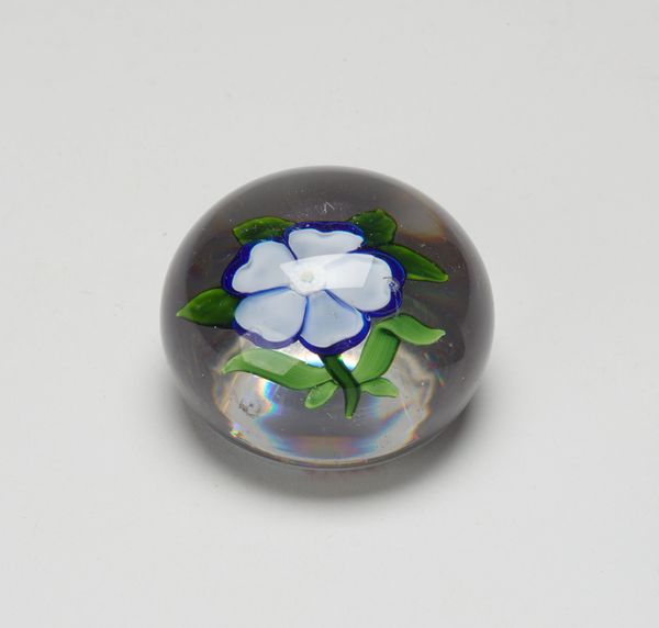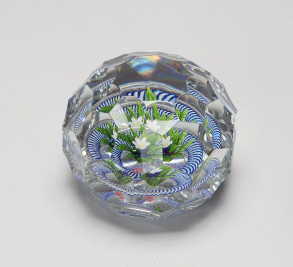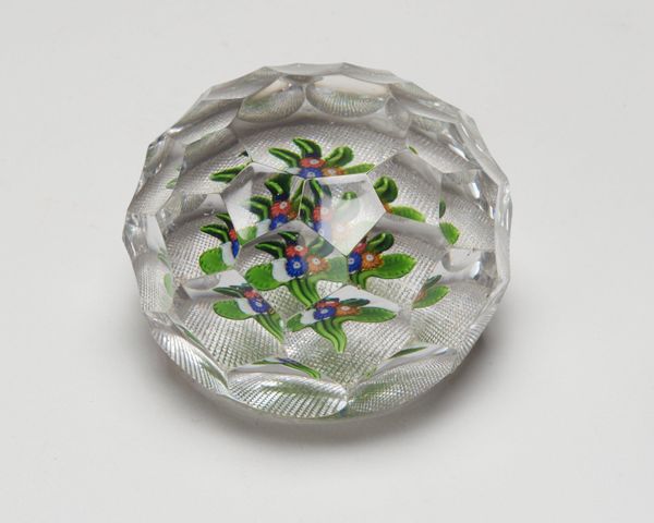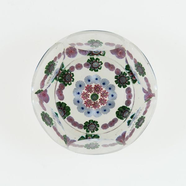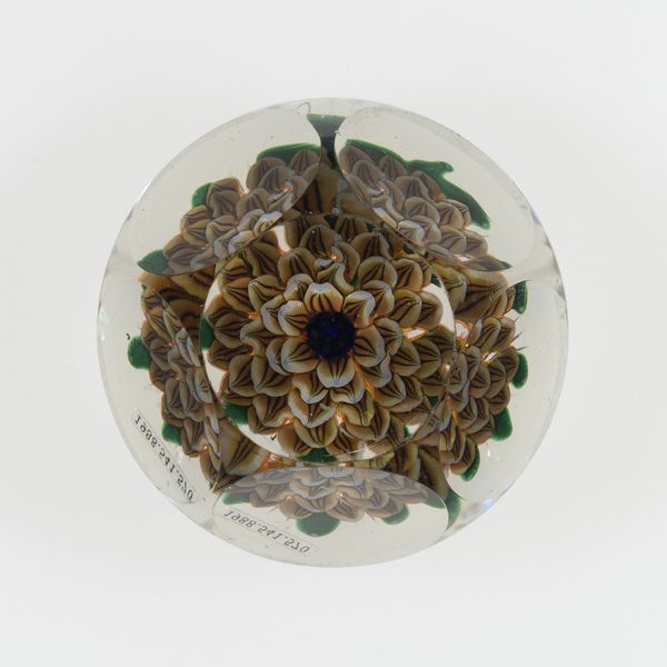 Curator: The Minneapolis Institute of Art holds this exquisite "Paperweight," a work from the 19th century attributed to the Clichy Glass Works. It’s a rather stunning piece of decorative art crafted from glass. Editor: It’s… peaceful. Like a little frozen garden, a micro-utopia preserved in crystal. There's something almost melancholic about trapping those daisies, though they still seem vibrant somehow. It really does have a nice way to draw in light to highlight them! Curator: The symbolism of flowers is often tied to notions of beauty, fragility, and the transience of life, but also rebirth. Daisies, in particular, have layers. Think innocence, purity, cheerfulness, but also resilience – they’re such common, persistent blooms. I think of those associations with its symbolic weight when considering that someone probably used this object daily. Editor: A tiny meditation on your desk… the opposite of our digital overload today. The flowers look so alive inside the glass, like a snapshot from the artist’s garden! Though, the crystal cuts give a rigid feeling to something that appears natural. It feels odd! Curator: Perhaps that’s part of the appeal, this juxtaposition. Clichy was quite renowned for their millefiori paperweights, where different colored glass rods are heated and arranged to form complex patterns, then encased in crystal. What do you read from its possible use as an office supply? Editor: Maybe the owner loved nature and beauty and longed for them! Or maybe they needed the constant reminder of something alive to deal with endless piles of lifeless papers. And the weight keeps the ideas... well, grounded. In the age of tweets and disappearing thoughts, that solidity is deeply comforting, I'd want to fidget with that glass all day. Curator: Exactly. Holding that weight—something of beauty but also function— connects one viscerally to a past where such tactile engagement with objects was commonplace. There's something wonderfully human about such connection that this particular piece seems to capture so eloquently. Editor: So true! A pretty bloom becomes something permanent and weighty, but the glass has these radiating patterns inside that almost vibrate in the right lighting. It feels more like art in the sense that something simple as a flower becomes multifaceted with reflection!