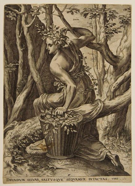 Editor: This is "The Young Saint John the Baptist," attributed to Hendrick Goltzius, residing here at Harvard Art Museums. The hatching is really striking. What do you see in this piece? Curator: Notice how the upward gaze and the symbolic animals—the lamb, the birds—position John as a conduit between the earthly and divine. Can you feel the artist drawing on centuries of Christian iconography? Editor: Definitely. It’s like a visual language. Curator: Precisely. And consider how the natural world, rendered almost feverishly, embodies spiritual yearning. Does the intensity of the landscape amplify John's calling? Editor: It does. I now appreciate the power of the symbols to deepen the narrative. Curator: Indeed, and understanding these symbols unlocks layers of meaning.