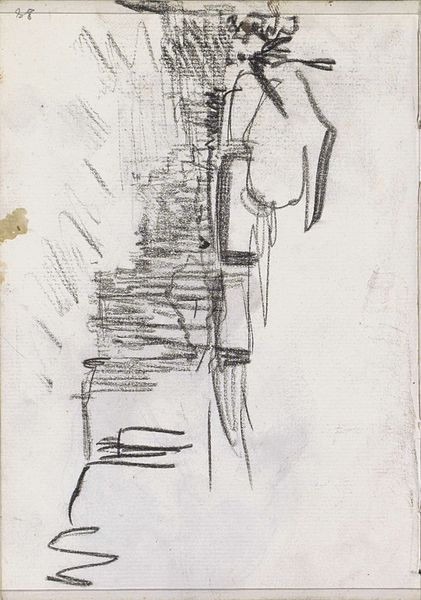 Editor: So, this is *Landschap met vee*—Landscape with Cattle—a charcoal drawing by George Hendrik Breitner, dating from around 1884 to 1886. It feels so immediate, like a fleeting glimpse. What’s your read on it? Curator: It’s a fascinating choice to represent rural life with such an unfinished aesthetic. Think about the context. Breitner, while associated with Impressionism, often depicted urban scenes. So, this raw portrayal of the countryside is interesting, almost a counterpoint. How do you think the artistic conventions of the Dutch Golden Age, as well as those of the impressionists influenced it? Editor: I hadn’t considered that tension between urban and rural. The looseness reminds me of some sketches, like a preparatory work, maybe before the more complete Dutch Golden Age style? Curator: Precisely. But look closer; Breitner seems to purposefully be playing with notions of "finish" and "subject." Why, in a period of increasing industrialization and urbanization, did artists return to pastoral themes? Was it pure nostalgia? Or, perhaps, something more critical? This artwork might be Breitner grappling with those issues in his own way. Editor: I guess I was just taking it at face value as a sketch of cows! Curator: But that’s where art history gets interesting. Even a quick sketch reflects the social, economic and political anxieties of its time. Who has access to what land, what defines "Dutch" identity in an era of sweeping change – it's all swirling in there. How did the urban art scene influence a drawing of the countryside? Editor: This really flips my initial impression of just seeing cows in a field. Curator: It encourages us to see beyond the surface and consider the conversations artworks participate in! And the role of public and private collections. Editor: So, even something seemingly simple carries a weight of history and societal influence!