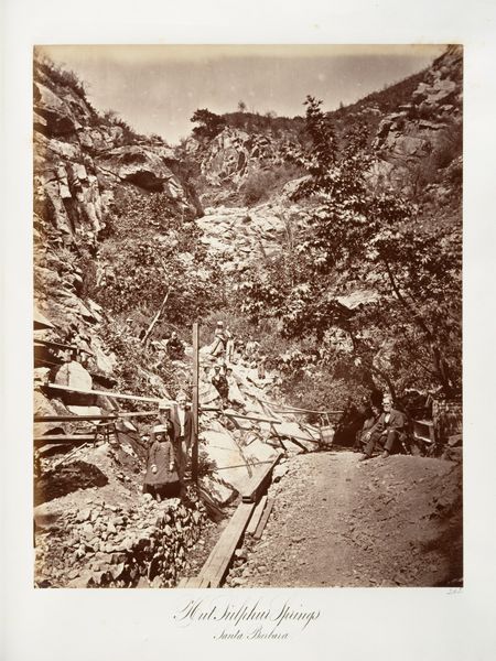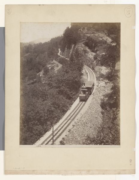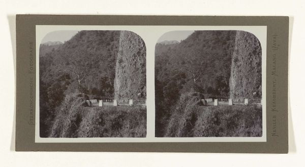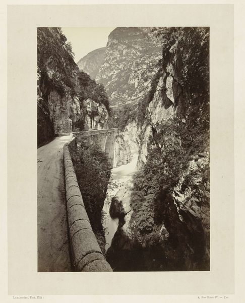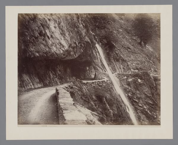 Editor: This is "Gezicht op een tunnel van de Col de la Schlucht", a gelatin silver print by Charles Bernhoeft, created before 1894. It’s a photograph of a road tunnel carved into a mountainside. It’s stark and emphasizes the solid geometry, like nature, engineering, and black-and-white tones working together to highlight mass and light. What compositional aspects stand out to you? Curator: The stark contrast between the sharply defined, geometrically precise tunnel and the rugged, seemingly untouched rock face is most intriguing. Consider how Bernhoeft frames the scene: the tunnel's circular void acts as a focal point, drawing the viewer's gaze inward. The texture, inherent in the gelatin silver print, amplifies this interplay. Do you see how the light illuminates one side, emphasizing form and materiality? Editor: Yes, it almost seems staged in how perfectly the light reflects on the entrance while everything around it blends into texture. The road itself provides such a severe horizontal slash between organic chaos on the mountainside. The photographer highlights and arranges visual information within the scene. Why that tunnel, why this arrangement? Curator: Precisely. It seems Bernhoeft is presenting a kind of visual problem—the contrast is certainly there, the composition is certainly structured. Perhaps it underscores human intervention or, at least, emphasizes the dialogue between nature and the built environment using formal contrast. Can you think of examples where that visual vocabulary can exist? Editor: The dialogue makes it come across as both, especially since Bernhoeft gives almost equal compositional weight to the mountain and the built environment. I'll look more at this tension and how the choice of materiality impacts the photograph as a medium. Curator: An excellent pursuit, using formalism to create an art historical frame!