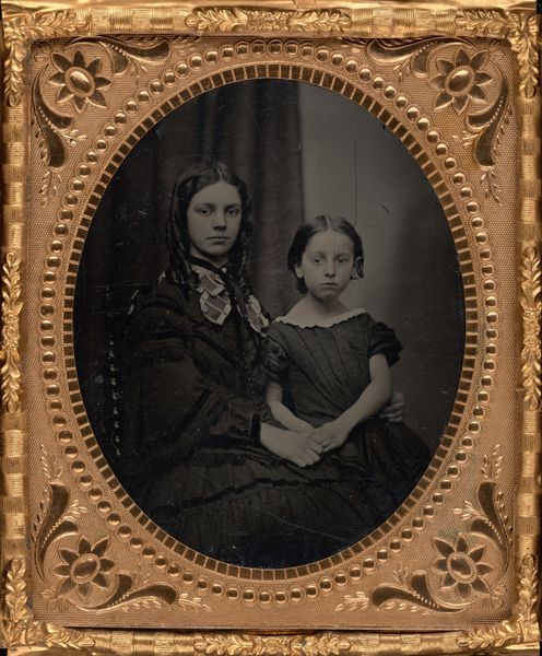 Editor: Here we have an 1847 daguerreotype, "Untitled (Portrait of a Woman and Girl)" by an anonymous artist, preserved at the Art Institute of Chicago. The expressions on their faces feel very serious. What can you tell us about this image? Curator: What strikes me is the very labor-intensive process required to produce this single image. Each daguerreotype was unique; there were no negatives for easy reproduction. We must think of the skilled labor, the silver-plated copper sheet, polished to a mirror finish, sensitized with iodine fumes... a truly alchemic process, beyond simple ‘photography.’ Editor: So, beyond just being a portrait, you see it as an artifact representing a whole mode of production? Curator: Exactly. And the societal implications are fascinating. Who were the patrons of this technology? Access was determined by economic and social class, wasn't it? How did this new, mechanical form of image production challenge existing artistic hierarchies like painting or miniature portraiture, think about that. Editor: It democratized image creation to some degree, yet remained quite exclusive. Curator: Precisely! Even the frame—the velvet and gilt— speaks to a rising consumer culture and the desire for durable, beautiful objects within a certain social strata. These photographic portraits would also shape social practices like creating images for rememberance and memorialisation, expanding image availability beyond the elite classes. The means of its creation dictates its value. What else do you observe about their clothing or what each holds? Editor: Thinking about it as a material object with a social life makes it so much more interesting. Thanks for the insight! Curator: Absolutely. By understanding the process, we can grasp the art's profound connection to 19th-century society and the evolving world of image production.