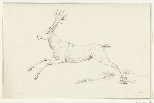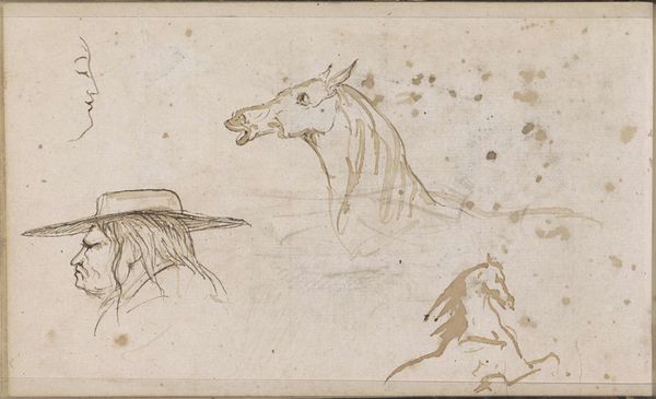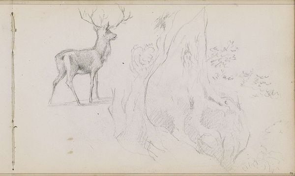 Curator: What an evocative, ethereal scene. There's a certain unfinished quality, lending to a mysterious atmosphere. Editor: We're looking at "Deer in a Woodland Setting," a pen and ink drawing by Johannes Tavenraat, created around 1865. It resides here at the Rijksmuseum. I'm struck by its apparent lack of refinement, almost as if it's a preliminary sketch rather than a completed piece. Curator: Precisely. Notice the delicate lines, the economy of detail used to render the deer and their surroundings. One can feel the artist searching for form, almost sculpting it out of the paper itself. Editor: The application of materials here is especially important, particularly the toned paper. It's clear the paper wasn't prepared merely as a ground; its inherent color serves an integral role in suggesting depth and the filtered light within the forest setting. Were these sketches ever intended for something more formal? Curator: That's the crucial question, isn’t it? The swiftness of the strokes suggests spontaneity. Given the historical context, with burgeoning urban life pushing back into untouched territories, Tavenraat’s work resonates beyond being just about wild animals. There's the implication of preservation—an artistic act emphasizing humanity's relationship with nature. Editor: I agree that Tavenraat’s piece functions more than simply capturing the look of animals in their habitat. It's fascinating how the seemingly incomplete nature of this study emphasizes the raw essence of nature before its potential transformation into consumer commodities. Curator: Indeed. There is a real rawness here, isn’t there? It leaves you pondering about the value we place on artistic "finishing" when, at times, it’s the suggestion that holds the greatest impact. Editor: Absolutely. This pen and ink piece pushes boundaries, redefining what comprises an artwork when it appears to have blurred the distinction between craft and high art by documenting natural resources so expressively.