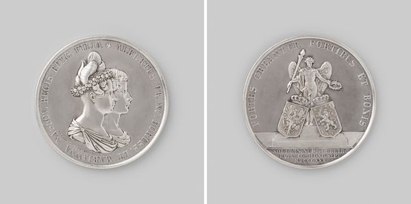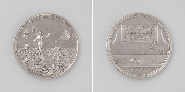 Editor: Here we have "Stillen van het aansprekersoproer te Amsterdam, penning aan de gewapende burgers vereerd," a metal relief sculpture made in 1696 by Jacob van Dishoecke. The detail is astonishing for something so small. One side features what appears to be Neptune, and the other... maybe a sunrise? It feels celebratory. What do you see in this piece? Curator: You’re right to see celebration. This medal commemorates the quelling of the “anschprekersoproer,” or undertakers’ revolt, in Amsterdam. Notice Neptune. Why Neptune, the Roman god of the sea, for an Amsterdam uprising? Think about Amsterdam’s power, built on maritime trade. Neptune here isn’t just a deity; he symbolizes Amsterdam's dominance over the seas and thus, its wealth and stability. The waves are calm here -- power maintained, stability ensured. Editor: So the sea, normally a symbol of the unknown, represents stability here. I wouldn't have made that connection on my own. Curator: Precisely. And look at the reverse. What does the sunrise symbolize, beyond the obvious? Editor: Hope? A new day? Curator: Yes, but more specifically, consider its placement above the small ship on a tranquil sea, coupled with the Latin inscription, *’Has sedato lis candente Senatus Amstelod…*’ Editor: It looks like a new era of peace dawning on Amsterdam. After the storm, there is finally calm. Curator: Exactly! The visual language is powerful: light overcoming darkness, order restored after chaos. Consider also the implicit message of divine favor—Neptune on their side. What cultural values are being reinforced here? Editor: Obedience to the Senate? The importance of maintaining order at all costs? Curator: And the strength derived from maritime power, all packed into a small, powerful object intended to be distributed among armed citizens who assisted with putting down the revolt. A powerful symbol of a complex moment in Amsterdam's history, isn't it? Editor: It is. Thanks for opening my eyes to all the layers of meaning embedded in this small coin!