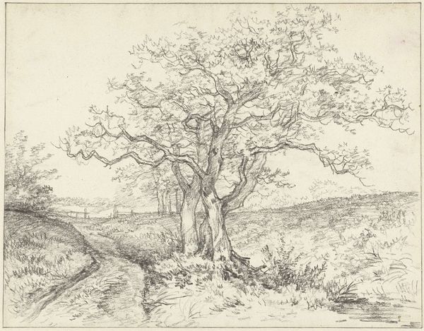 Andreas Schelfhout made this drawing, Landschap met bomen, using graphite on paper. It may seem like a simple sketch, but consider the process: Schelfhout carefully observed the trees, translating their forms onto paper through the deliberate application of graphite. The varying pressure and density of the graphite create depth and texture, bringing the scene to life. See how the artist captures the rough bark of the tree, the delicate leaves, and the subtle variations in light and shadow. The act of drawing is an intimate engagement with the subject matter. It demands close observation, skillful hand-eye coordination, and a deep understanding of form and space. This contrasts with industrial modes of production. Drawing retains the mark of the artist's hand, revealing the labor and skill involved in its creation. Thinking about the drawing in terms of material and process gives us a deeper appreciation of both the artwork and the artist. It also challenges traditional notions of art, inviting us to consider the value and significance of skill, labor, and direct engagement with the world around us.
