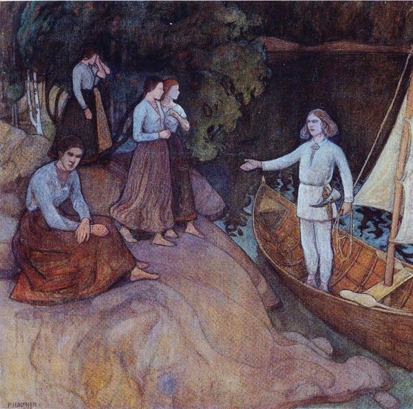 Odilon Redon created this pastel artwork, 'Boat with Two Figures', sometime in the late 19th or early 20th century. The composition features a boat cutting through the water, dominated by a large sail that occupies much of the upper left quadrant. This pale sail sharply contrasts with the dark night sky, speckled with stars. Redon's symbolism emerges through his unique use of colour and form. The figures in the boat are ethereal, their forms dissolved into swathes of colour that suggest rather than define. The juxtaposition of the vibrant orange cargo with the ghostly figures creates a tension, challenging fixed meanings by blending the material and the spiritual. The artwork operates within a semiotic system where the boat may symbolize a vessel of transition, and the figures could represent aspects of the self or the soul. It invites us to question our perception of reality, and recognize the fluidity of meaning inherent in artistic representation.