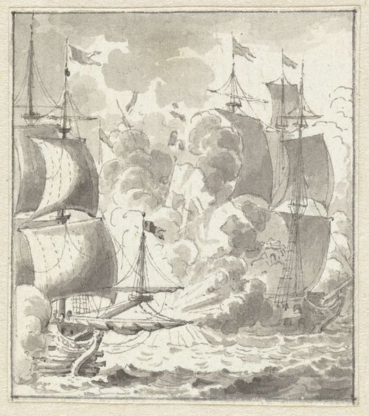 This print, made by Reinier Vinkeles, depicts the Dutch raid on the Medway in 1667. Vinkeles, active in the late 18th and early 19th centuries, was working well after the historical moment he depicts here. The image is an engraving, a printmaking process where lines are cut into a metal plate, which is then inked and pressed onto paper. The fineness of the lines speaks to the engraver’s skill, and the capacity to render a wide range of tones, from the billowing smoke to the reflective water. Consider the labor involved, both in the depicted scene of naval warfare – the sailors hauling ropes, firing cannons – and in the production of the print itself. This was a time of intense competition for resources, reflected in both the subject of the image, and the skilled work that produced it. Engravings like this one helped to shape public perception of such events, turning acts of military aggression into enduring images. The print reminds us that even seemingly straightforward historical depictions are shaped by the materials and techniques used to create them, and the social contexts in which they circulate.