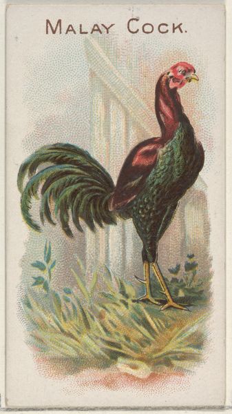Editor: This is “Black Frizzled Fowl” from 1891, a coloured-pencil drawing that was made into a print. It's from a series of cigarette cards by Allen & Ginter. There's something quite striking about it, this solitary black chicken. I'm curious, what symbols or associations does it bring to mind for you? Curator: Ah, yes, the "Black Frizzled Fowl." On one level it simply presents a prize chicken. But, within the cultural memory of fowl, across cultures, chickens represent a multitude of aspects: virility, certainly, and even aggression. Think of the cockfights. The striking red comb is especially important. But the "frizzled" aspect makes him less fearsome, even ornamental. Do you get the sense that his black feathers absorb the light? What emotional response does this trigger? Editor: It does feel absorbing somehow, not vibrant. There is some green, but... I feel more of a melancholic or contemplative vibe because of that absorbing effect. Also, because he's alone. Does that resonate at all? Curator: Indeed. Color, as you point out, plays a crucial role. Black often symbolizes mystery, the unknown. Coupled with its isolation, a sense of contemplation certainly emerges. The artist’s intention is unclear – was it purely commercial? – or do you see something else? Think about its original purpose: enticing people to buy cigarettes. It may tap into primal associations with virility to attract smokers. Editor: That tension is fascinating; commerce versus deeper symbolism. That changes how I see the image entirely. Curator: Precisely! And perhaps it’s a useful reminder to keep an open mind in the process of viewing works. These kinds of symbols carry layers, right? It gives the image depth. Editor: Absolutely, I agree. Looking at it now, I realize it speaks more about the complex symbolism we attribute to the world around us than I first realized. Thanks for sharing these thoughts.
