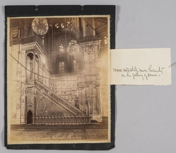 Curator: Félix Bonfils captured this view of Shepheard's Hotel in Cairo. Editor: There's a stillness to the image, a quiet formality, like a stage set. Curator: Indeed. Shepheard's was more than just a hotel; it was a social and political hub, a symbol of Western influence in Egypt. Editor: The veranda itself feels like a proscenium, framing interactions between Europeans and locals. The costumes, the posed figures, all suggest a performance. Curator: The photograph reinforced ideas of exoticism and hierarchy. The Western gaze solidified its power through such imagery. Editor: Yet, there's also a sense of anticipation, figures waiting, observing each other. It's a compelling visual record of a complicated time. Curator: It is. Bonfils' photograph serves as a lens to examine the dynamics of empire and representation. Editor: Ultimately, it's a potent reminder that images always carry layers of meaning beyond their surface.