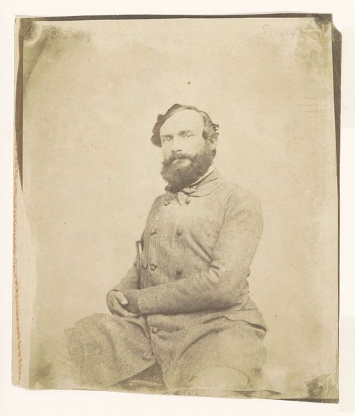 Editor: This daguerreotype from 1855, by Roger Fenton, presents Sir Charles Ash Windham. The subdued tones create such a serious mood. What symbolic weight do you see in this portrait, given its historical context? Curator: Indeed, the weight is palpable. The daguerreotype, in its very process, served as a new kind of historical witness, offering a seemingly objective truth. But observe Windham’s pose. It’s deliberately relaxed, almost casual. What might that suggest to you? Editor: Perhaps a display of confidence, of a man secure in his position, even amidst war? Curator: Precisely! And consider his gaze: direct, unwavering. It embodies a particular type of stoicism popular at the time. His military attire, immaculate and precise, further reinforces the image of authority, duty, and adherence to cultural expectation. There is the English stiff upper lip, quite literally captured in silver. How does this connect with your understanding of England at the time? Editor: Well, I know the Crimean War was controversial, and the public was getting more news from the front lines… So perhaps this portrait served to project strength and leadership back home, combatting those anxieties? Curator: An astute observation. Photography became a tool – or a symbol -- for shaping public perception during conflict. It became an artefact imbued with cultural anxiety. Did seeing this in photographic form instead of painted change your impression? Editor: Absolutely, I had not thought of the then-modern photographic techniques lending their own meaning. It shows photography could act not just as a recorder, but also a very active storyteller! Curator: Indeed. It’s a potent reminder that even the seemingly objective can be laden with cultural intent.
