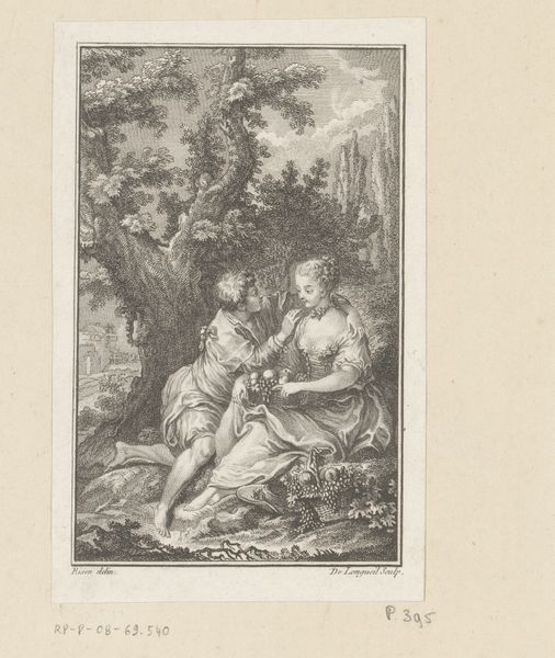 Curator: Ephraim Gottlieb Krüger's "Death of Clorinda" presents a dramatic scene. The tonality feels heavy, laden with grief. Editor: This engraving certainly evokes a sense of profound loss, doesn't it? It stages a compelling narrative around female victimhood. Curator: Absolutely. It's part of a larger tradition of representing women as vulnerable and sacrificial figures within patriarchal narratives. Krüger, working in the late 18th and early 19th centuries, participated in reinforcing these gendered power dynamics. Editor: But observe how the light emphasizes Clorinda's form against the darker backdrop, creating a poignant focal point. The male figure, in full armor, seems almost secondary in this visual hierarchy. Curator: Perhaps, but the male gaze still dictates the terms of her representation. Consider the symbolic weight of her exposed chest, signaling vulnerability and surrender in death. Editor: The contrast between the smooth skin and textured armor creates a visual tension, highlighting the stark differences between the characters. Curator: It's a tension that reflects the social disparities of the time, where gender and class intersected to define individual experiences of power and agency. Editor: Ultimately, Krüger offers a potent study in contrasts. Curator: Yes, a stark reminder of how art can reflect and perpetuate cultural norms.