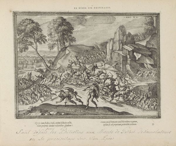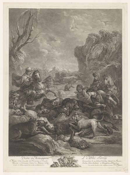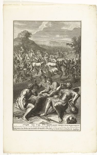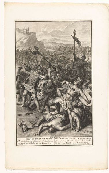 Editor: So, this engraving, "Veldslag van Alexander de Grote en Poros" created around 1717 by Bernard Picart depicts the Battle of the Hydaspes. I'm struck by the intense drama but also how it feels almost staged. What jumps out at you when you look at it? Curator: The engraving captures more than just the historical battle; it captures the clash of civilizations and philosophies. The symbols are practically bursting from the composition: the fallen elephant represents Eastern power brought down, juxtaposed with the emerging, 'rational' order of Alexander's Greece as implied by the orderly lines of men with their spears in the distance. Editor: I hadn't considered the elephant quite that way. So you're saying it's about more than just military conquest? Curator: Absolutely. Picart, likely consciously, or perhaps subconsciously, placed familiar iconography within an entirely new symbolic order. It evokes deeper questions about the nature of power and the narrative that surrounds conquerors. Alexander wasn’t simply a military leader, he becomes a symbol. What message is embedded for the people looking at it then, versus now? Editor: It makes me wonder about how our perception of 'heroes' changes over time and who controls those narratives. The text at the bottom seems to echo this concept. "True valor is always invincible"... Curator: Indeed. It speaks to a human desire to imbue events with deeper meaning and to remember and pass these images through history as memory and knowledge. Editor: Thinking about it, this engraving serves almost like a historical meme, distilling complex events into readily understandable symbols for the cultural understanding of the viewers at the time and today. Curator: Precisely. The genius is that, centuries later, we are still actively decoding these embedded visual prompts to form knowledge, creating, even today, fresh readings that reveal aspects of our cultural psyche.