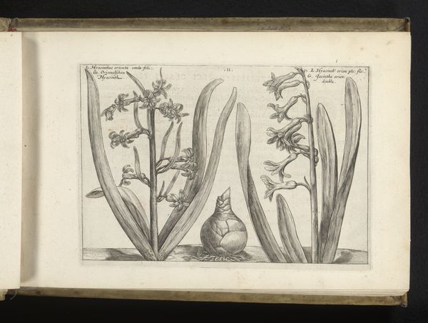This engraving, "Herfsttijloos en een variant" by Crispijn van de Passe II, made sometime between 1597 and 1670, presents a meticulously rendered botanical study using the stark contrast of line etching. The composition arranges various forms of the autumn crocus in a regimented yet organic manner. The lines, precise and deliberate, delineate the texture of petals and leaves, creating a delicate interplay between light and shadow. Notice how the artist employs a semiotic system of naturalism and nascent scientific inquiry, presenting the flowers not merely as aesthetic objects, but as specimens of natural philosophy. The varying perspectives and orientations of the flowers introduce a structural instability, inviting viewers to consider the complexities of representation. The artwork encourages ongoing interpretation of the natural world through the structured lens of artistic expression.