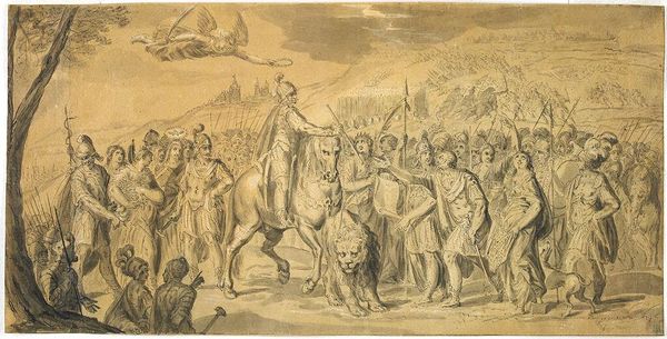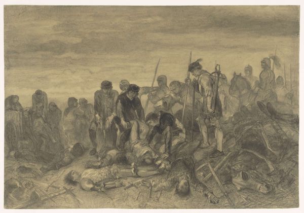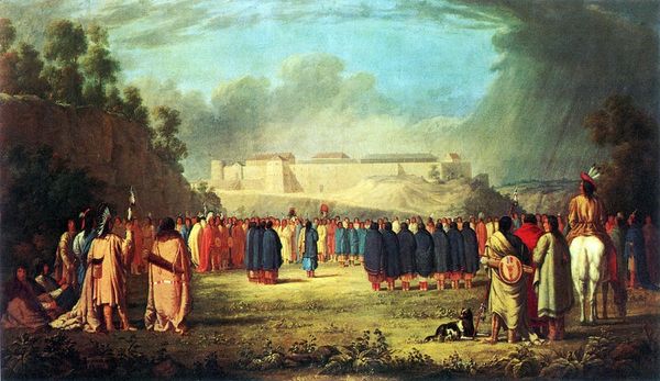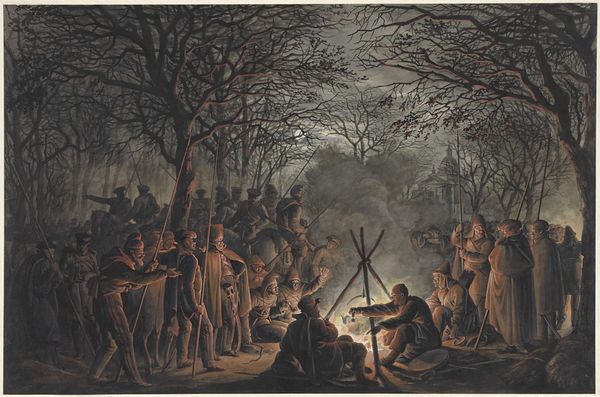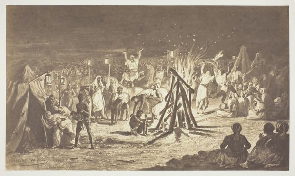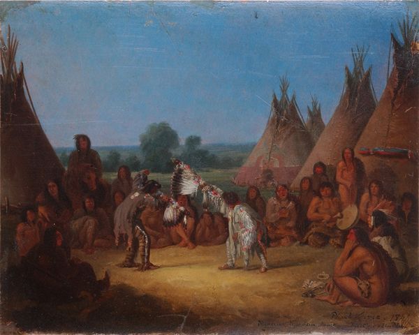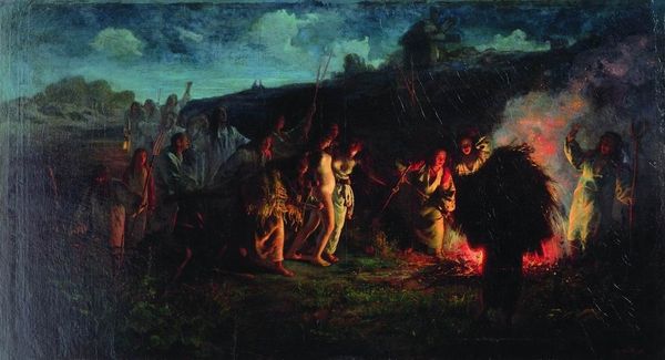 Paul Kane painted "Scalp Dance by the Chualpays Indians," capturing a scene bathed in the warm glow of firelight. The painting’s composition draws us to the figures arranged in a semi-circle around a central fire. Notice how Kane uses light and shadow to define forms, creating a sense of depth and drama. The fire casts long shadows, heightening the emotional intensity of the scene. The formal organization is hierarchical, with the central figures more detailed and brightly lit, which draws attention to their significance within the ceremony. The painting's structure destabilizes established meanings through its depiction of indigenous ritual. Kane uses visual language to reflect broader cultural and historical contexts, engaging with questions of representation and power. The semiotic system, visible in clothing and artifacts, allows the image to communicate cultural codes. The painting functions aesthetically and contributes to a larger cultural dialogue. The dynamic interplay between light and shadow embodies the complex relationship between representation, perception, and cultural interpretation.
