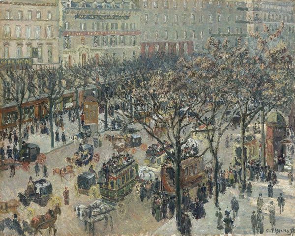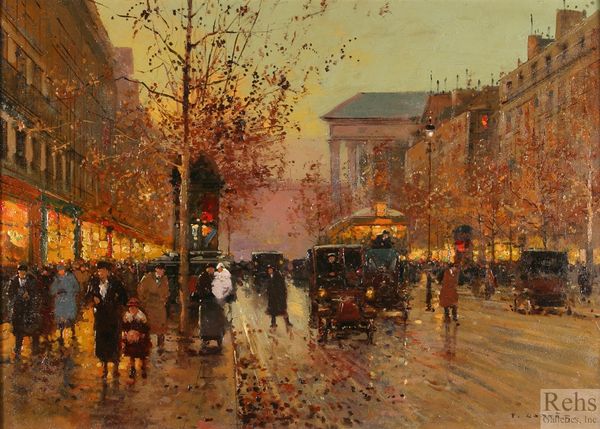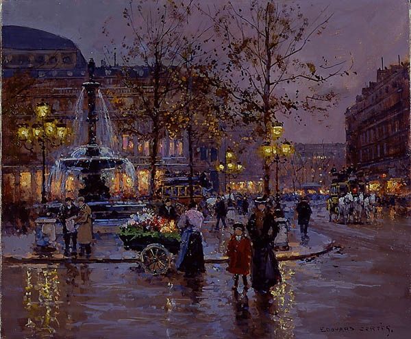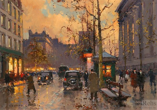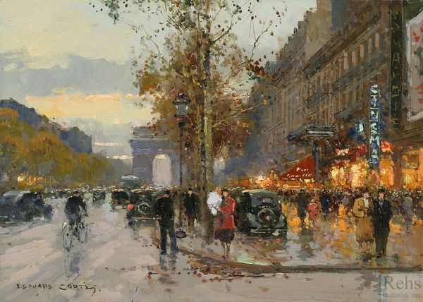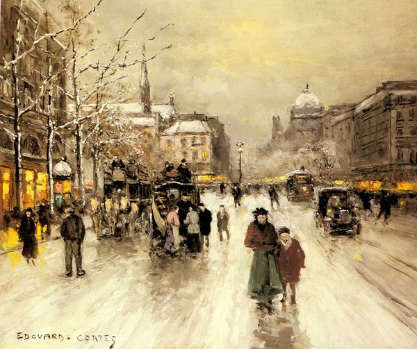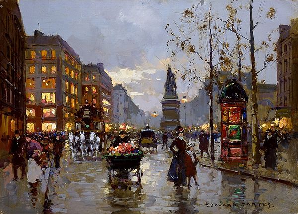 Édouard Cortès painted this small oil on canvas titled, *Place du Theatre de la Comedie Francaise*. Cortès, the son of a painter for the Spanish Royal Court, dedicated much of his oeuvre to capturing the changing urban landscape of Paris. Here, Cortès depicts a Parisian street scene, alive with the energy of a bustling city at dusk. While the architecture suggests permanence and grandeur, the people are rendered with quick, loose brushstrokes, capturing their fleeting presence. Consider the historical context: Cortès painted during a period of rapid industrialization and urbanization in Paris. How did these societal shifts impact individual experience? The glow of the streetlights and the reflections on the wet pavement evoke a sense of nostalgia, romanticizing the city. Yet, there's also a feeling of anonymity, as people navigate the modern metropolis. Cortès doesn't offer a clear narrative, but rather an impression, a sensory experience of being in Paris. It is a dance between the individual and the collective, between the enduring beauty and the transient nature of modern life.
