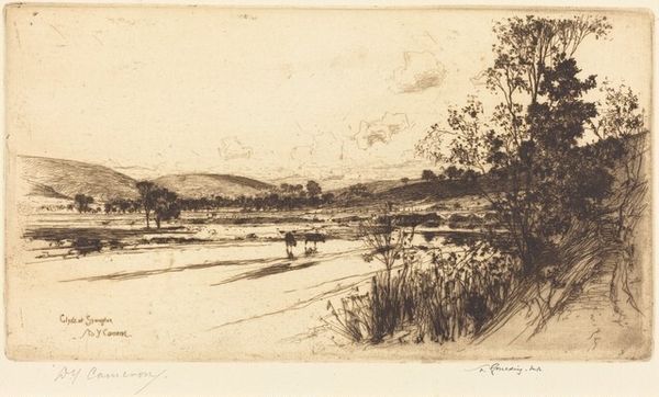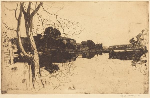 Curator: Welcome. Today we’re looking at “Tweedside,” an etching by David Young Cameron, completed in 1890. Editor: It's so quiet, almost melancholy. The landscape stretches far back, and the reflections in the water add to the feeling of stillness. What strikes you formally about its composition? Curator: The tonal range is masterful for an etching, creating a depth and luminosity that’s quite evocative. Observe how Cameron uses the etching technique itself – the cross-hatching and varied line weights – to suggest atmospheric perspective. It pushes the surface and bends the implied shape of what it should represent. Editor: Etching as a process involves a certain labor. Thinking about it, the bitten lines, the time spent with the acid... There’s a collaboration there, between artist and material, and the unpredictability would definitely shape the final piece. Was Cameron part of any artistic movements at the time exploring materiality? Curator: Cameron was closely tied to the British Etching Revival, aligning him with artists keenly interested in the inherent qualities of the printmaking process itself. The manipulation of the plate to achieve desired effects – like the soft, blurred sky versus the sharp details near the shore – reveals a conscious control of the medium's potential, a conscious emphasis of it in the finished work. Editor: And consider the river, Tweedside, as a working landscape – people transporting goods or fishing. The quietness of the scene belies the industrial aspects and daily labors associated with the area. You could make tools there... Curator: It's fascinating how you’ve brought out the intersection of the industrial and idyllic. I think it enriches our understanding to look at Cameron's other work. He often imbued landscapes with a sense of monumentality, which relates formally to the scale and balance found here. Editor: To circle back to its somber and muted mood, paying attention to how these landscapes function reveals how people exist alongside it. Curator: I appreciate that reflection – it gives "Tweedside" an anchor and reminds us about all aspects that affect what we’re experiencing here in the print itself.