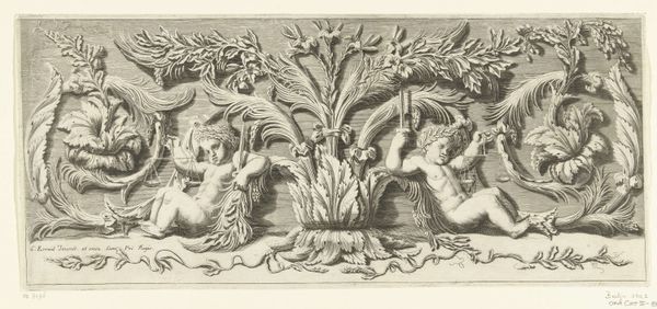 Editor: So this engraving, "Tast," from around 1655, artist unknown, at the Rijksmuseum... It's busy! There's so much detail packed into this small space. All the flora, fauna and cherubs - what do you see in it? Curator: I see the means of production. This engraving wasn't just about representing 'Taste' allegorically, but about demonstrating the skill and labor invested in the printmaking process. Consider the accessibility of prints. Who owned these, and how did their understanding of "taste" differ across social classes? Editor: That's a good point. It being a print would’ve impacted the materials, price, and consumer. Do the animals and putti have an impact on the artwork beyond the central figure? Curator: Absolutely. The cherubs, flora, and fauna surrounding "Tactus" are not merely decorative. What kind of paper was typically used in the mid 17th century? And how would its texture and availability influence the final product and who eventually possessed this artwork? Consider, too, what dyes were used to create and highlight details in the artwork; depending on who made them or from where they are from, they provide different messages. Editor: Right, the cost and availability of materials dictated the final piece and who interacted with it. The materiality connects directly to its social function. Curator: Exactly. How does understanding this affect our appreciation of the artistic labor and economic value of "Tactus"? Editor: Now I see how examining the process and social context deepens the meaning far beyond just allegorical representation. It highlights who had access to these artworks. Curator: And that, ultimately, influences our understanding of the artwork itself and also reveals more information about the art era of the engraving, touching on a broader scale of materials that also influenced and marked the Baroque.