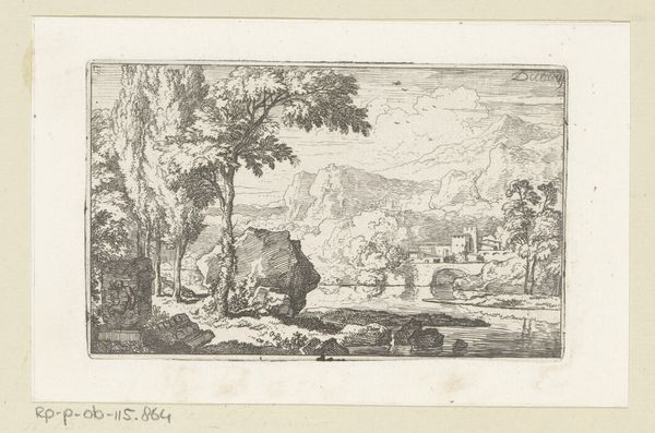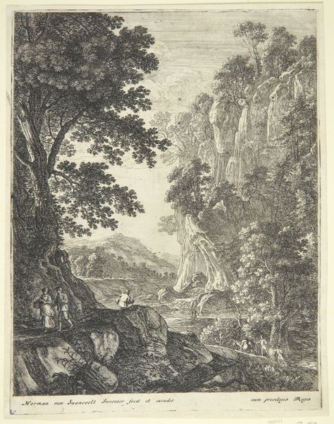 Editor: So, this is *Landschap met watervallen*, a landscape by Felix Meyer, probably made between 1663 and 1713. It's a print, an etching, with possibly some engraving. It feels both idyllic and a little…chaotic, almost claustrophobic. What are your thoughts when you look at this piece? Curator: I see a really interesting tension, which echoes so much of the period's socio-political upheaval. Meyer's idealized landscape exists within the context of immense societal changes. Think about the burgeoning mercantile class and their appropriation of nature. Does this idealized landscape reflect a societal longing for stability, a counterpoint to rapid urbanization and shifting power structures? Editor: That's fascinating. I hadn't considered that. I was just focused on the, like, picturesque waterfall. So you're saying it might not just be a pretty scene? Curator: Exactly. The very act of portraying this landscape could be a statement. Who is this landscape for? Is it accessible to everyone, or is it a visual representation of ownership and privilege during an era defined by inequality? Consider how landscapes often functioned as assertions of territorial control. What do you see happening in the contrast between light and shadow here? Editor: Well, the light definitely highlights the waterfall and the open space in the middle, but the dark areas feel denser, maybe even a bit threatening. Curator: Precisely! That use of light and shadow isn't just aesthetic. It could be interpreted as a visual metaphor for the known and unknown, the controlled and the wild, mirroring the era's anxieties surrounding the changing world. These weren’t neutral depictions. The social constructs were loaded into these images. Editor: Wow. I’ll never look at a landscape the same way again. Thank you, this has really changed how I approach thinking about art. Curator: Absolutely. That's the beauty of looking at art through an intersectional lens – it allows us to unearth the hidden narratives and power dynamics embedded within the artwork.