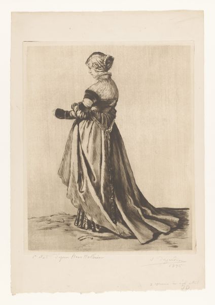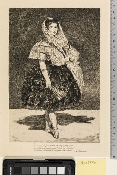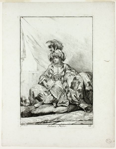 Editor: This is an etching by Francisco Goya entitled "God Forgive Her: It's Her Own Mother." The stark contrast makes the image feel unsettling. What do you see in Goya's composition? Curator: The etching's power lies in its deployment of aquatint. Notice how Goya uses it to create a tonal range, from the velvety blacks of the figures' clothing to the subtle gradations of the background, heightening the dramatic intensity. What do you make of the figure's gaze? Editor: Her eyes are rather vacant. Perhaps this is commentary on social standing? Curator: Indeed. The visual language—the figure's pose, the etching style, the aquatint—establishes a compelling, if disquieting, aesthetic experience. Editor: Thank you. The attention to visual components definitely changed my perspective.