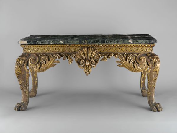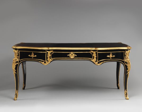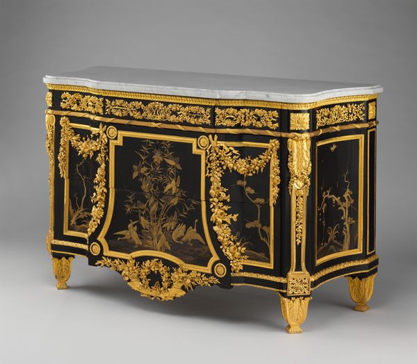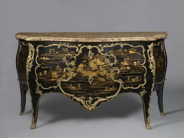 Editor: This exquisite commode, crafted by André Charles Boulle sometime between 1705 and 1725, immediately strikes me as a statement of opulence. Made with brass, wood, and marble, the contrast of materials creates an intriguing surface. What’s most striking to you about this Baroque piece? Curator: For me, it's the layering of labour, both literally in the construction and figuratively, reflecting the social hierarchy of the period. The exquisite marquetry, the precise carving, and the rich materials… These speak volumes about the craftspeople involved, their skill, and the economics that enabled such production. Editor: How so? What does the labour and material tell us about this artwork? Curator: Think about it. Boulle wasn't just designing; he was overseeing workshops. The materials like the marble and brass had to be sourced, traded, and transported. Wood requires knowledge of specific varieties. This process highlights global connections and a system where luxury was underpinned by considerable material resources and specialized labor. Editor: So, it's not just about aesthetic beauty but also the conditions that made the beauty possible? Curator: Precisely! The commode exemplifies the Baroque style but examining the labor and material forces involved can expand our understanding. How much human capital was deployed to produce and circulate it and whom did it ultimately benefit? What do you think? Editor: That makes a lot of sense. Viewing this piece through that lens completely changes how I perceive it! I guess it’s important to look beyond the gilded surface. Curator: Absolutely. Understanding art means understanding the social and material conditions that allow it to exist. Now, when you look at other decorative objects from this period, maybe you'll consider the unseen hands and material supply chains.