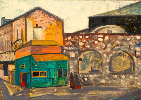 Curator: Here we have "Grand Motel" by Dan Graziano, rendered in oil paint with a distinctly plein-air approach and notable impasto texture. Editor: My first thought? Nostalgia dipped in sunshine and slightly faded memories. It’s got that California light vibe. Curator: Absolutely. And given the subject matter—a roadside motel—it evokes a particular sense of American identity, one intimately tied to mobility, leisure, and even a certain working-class aesthetic. These places, often family-owned, stand in contrast to corporate hotel chains. The vibrant yet slightly weathered appearance can speak volumes about the changing landscapes of small businesses. Editor: Yeah, totally. It feels like one of those places where you might find the best stories—and the most interesting characters, for sure! The graffiti art feeling definitely hints at that undercurrent, a little grit under the golden sun. There’s something about these almost-forgotten roadside stops…they have stories etched in their peeling paint, you know? Curator: Exactly. Graziano’s technique, particularly the impasto, adds to this sense of tangible history, doesn't it? The thick layering of paint mimics the layers of time and experience. It is definitely nodding toward street art, in which one act covers another. I think there is a very important point in viewing it in its cityscape setting, because so much about the city we would not recognize had that original building been replaced by more "modern" facilities. Editor: It really does. I imagine running my hand over the canvas and feeling the bumps, the grooves, like the aged facade of a building. There is almost a quiet to it, you know? Like right before sunrise on an open highway... and where is everyone at? Why are they not staying at the Grand Motel? Maybe that feeling gives it a sadder tone. It also plays on my appreciation of decay. Curator: I agree. It prompts a certain melancholy. Perhaps because motels themselves exist in liminal spaces – temporary homes, fleeting moments of respite within larger journeys, and their own life cycles which, like any social institution, also decline. Editor: Yeah. It also hits on those points we reach in travel... How much longer on this trip? Is there anything after this destination? And then... where do we sleep. Curator: That feeling underscores so much more about the intersectionality between the American dream and mobility. The city landscapes we travel change rapidly. This painting causes introspection that other more forward pieces of art simply do not engage. Editor: In that respect, I agree wholeheartedly. It has so much soul in a deceptively simple image. It is worth contemplating how a simple corner scene might invite that type of discussion.