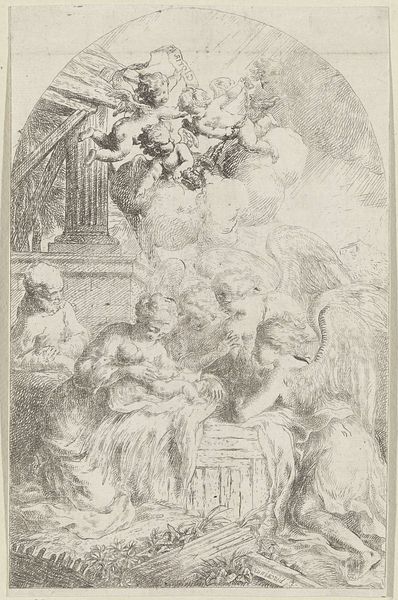Curator: We're looking at "Geboorte van Christus", or "Birth of Christ," an etching created by Bartolomeo Biscaino, sometime between 1642 and 1657. Editor: It has this soft, dreamlike quality, doesn't it? All delicate lines and subtle shadows. It’s as if the scene is veiled, holding a gentle secret. Curator: Indeed. Biscaino masterfully employs the etching technique, building form and space through intricate networks of line. Note how the composition is carefully contained within the oval frame. Editor: I love how the lines create so much texture. You can almost feel the coarse fabric of their clothing, and the soft skin of the newborn. Even the ox looks like it’s made of gentle, textured wool. The light, though, is everything. It makes the mother's expression really intense. Curator: Observe the visual weight: it’s concentrated around the Virgin and Child, drawing the eye to the heart of the narrative. The other figures are secondary, but essential elements to balance the composition. There's the formal interplay between the figures, arranged not to create a sense of realism but a dynamic tableau. Editor: Tableau is right. There's a posed feeling—less spontaneous and more deliberately symbolic. And you have to think, who are those angels supposed to be behind her? Is it one figure repeated? Their faces lack… personality. More like design elements. But overall, I find it beautiful—and quietly odd. Curator: The beauty you describe is precisely located in the execution of the form—its linearity. Editor: It reminds me of why stories, myths, get handed down. You interpret your birth and try to get it to look pretty for those around you, for the future people too, I guess. Curator: A lovely interpretation. The ability of such works to resonate over centuries, despite the change in aesthetic trends, speaks to their enduring formal strengths. Editor: An incredible image, full of whispers.