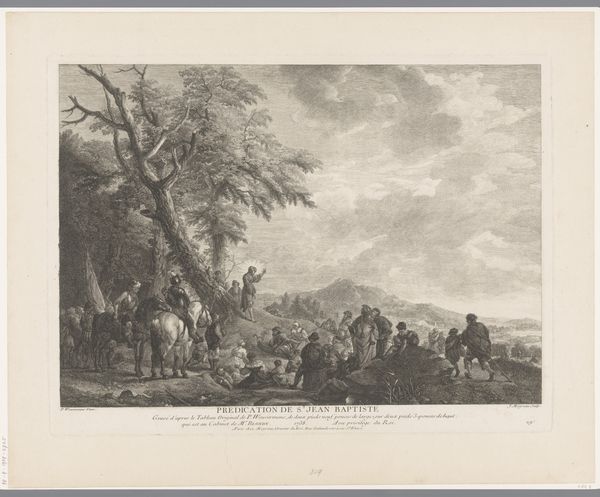 Editor: Here we have Jacques Aliamet's engraving, "Vrijkopen van een tot slaaf gemaakte in een landschap met ruïne", dating from somewhere between 1736 and 1788. The scene, rendered in incredibly fine lines, seems to depict the freeing of a slave. It definitely evokes a sense of both hope and solemnity. How do you interpret this work, particularly in its historical context? Curator: This piece offers a window into the complex relationship between European society and slavery during the 18th century. The engraving’s dedication to a high-ranking official—a Minister of State—highlights how the issue of slavery was very much on the public agenda. Notice how the artist juxtaposes the classical ruin with the bustling port. Editor: Yes, I see that contrast! It's like a before-and-after image. What do you mean about the issue of slavery being "on the public agenda"? Curator: It signifies the fading glory of past empires alongside the emergence of new economic systems heavily reliant on the transatlantic slave trade. Prints like these played a crucial role in shaping public opinion and disseminating ideas, albeit within the confines of existing power structures. Whose freedom are we *really* celebrating? Editor: So, the engraving isn't necessarily a straightforward celebration of abolition, but also a commentary on the economic and social realities of the time? Curator: Precisely. It’s a visual document reflecting the socio-political climate, revealing how artists engaged with controversial subjects and navigated the prevailing ideologies of their era. Editor: That’s fascinating. I had initially viewed it through a purely humanitarian lens, but seeing it as a reflection of power dynamics really shifts my perspective. Curator: It's crucial to examine how these images functioned within the historical landscape. They're rarely neutral; they often served specific purposes and appealed to certain audiences. Considering the date range you provided and its visual style, where do you think this work would fit within the context of art and social movements? Editor: Thinking about it now, I will try to ask more probing questions to understand not just the image, but also how art contributes to a broader discussion. Thanks for clarifying things. Curator: Indeed, a fruitful consideration. Every picture tells a story but the true context shapes its meaning!