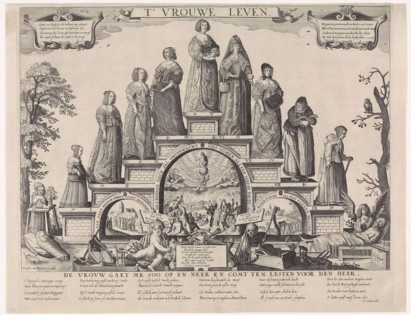 Curator: This is an engraving entitled "Trap der voorbeelden des Heeren Jesu Christi," dating roughly from 1648 to 1712, and attributed to Frederik de Wit. It's currently held in the Rijksmuseum collection. Editor: My first impression is that it looks very ordered and allegorical. A pyramidal structure of figures dominates, and the print's details and lettering give it the feel of a carefully constructed argument. Curator: Precisely. The “ladder,” as the title translates, illustrates key Old Testament figures ascending towards Christ. We see prophets, patriarchs, priests... each figure is rendered with significant individualizing detail, despite the relatively small scale. They each become symbolic types. Editor: How do you mean, symbolic types? Curator: Think of the image as representing an argument for divine authority and the lineage leading to Christ. Noah, Abraham, Moses – each stands for an ideal of obedience, faith, law, and so on. Each figure on the stairs advances a stage in the spiritual progression toward Jesus as he is meant to fulfill the promise of the Old Testament. Editor: I can certainly see that, particularly given how consciously it places narrative scenes at the very base of this ladder: the nativity, the expulsion from paradise, the resurrection. Those function almost like prefigurative bases or support for those higher up in the hierarchy of spiritual development. Curator: Right, each figure stands upon those foundations of Biblical history. This structured, hierarchical approach to visualizing religious history reflects Baroque sensibilities, the taste for order, classification, and above all didactic clarity in visual communication, especially religious visual communication. It almost resembles an ancestral family tree. Editor: I wonder how accessible an image like this would have been to the average viewer? The Latin inscription "Huic omnes prophetae testimonium perhibent" suggests at least some intended audience of scholarly elites or literate patrons. I wonder what they would have understood about its history and implications. Curator: Good point, its distribution likely depended on social standing and education levels during the Dutch Golden Age when religious and political ideologies deeply intertwined within public life. Its meaning could vary depending on one's background and interpretive lens at that specific moment in history. Editor: Ultimately, studying works like these reminds us that artistic expressions were as vital a tool as written treatises in negotiating ideas of cultural memory, authority, and identity throughout history. It is important to remember those conversations of cultural identity are ongoing.