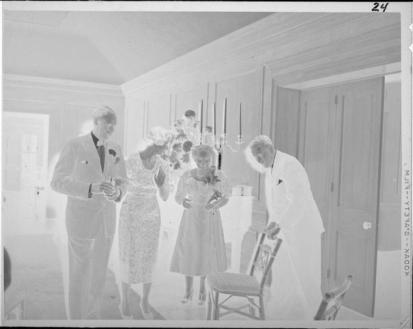 Curator: This arresting gelatin silver print, about 5 by 4 inches, is an untitled photograph by Lucian and Mary Brown, housed here at the Harvard Art Museums. What strikes you first about it? Editor: The playful unease, definitely. It's an inverted world—the boys are glowing, and the dark sky looms like a threat. Childhood frozen in a moment of suburban gothic. Curator: The process itself is interesting; gelatin silver prints were a common means of photographic reproduction, allowing for relatively easy mass production and dissemination of images. Consider how different this is from contemporary digital photography. Editor: Yes, it feels distant, almost ghostly because of that. It's as if the labor of printing enhances the subject. I wonder what the boys thought about posing? Did they see it as work, or art? Curator: Or neither. This photograph makes me think about the social context of mid-century American childhood. Editor: A haunted, but beautiful memory. Curator: Indeed.