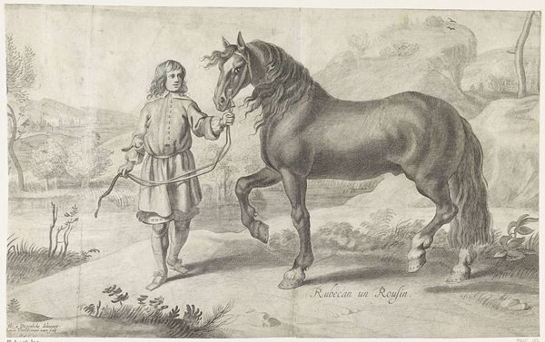 Editor: This is "Soldier Equipping a Horse" by Charles II Errard, made sometime between 1616 and 1689. It's an engraving. There's a strange stillness about it, despite the soldier and the horse seemingly preparing for action. What significance do you see in their interaction? Curator: Note how the horse almost mirrors the soldier's pose, a subtle echo suggesting a deep connection. Consider, too, the Baroque era's fascination with classical antiquity. Does the soldier's attire evoke images of Roman or Greek warriors? Editor: Definitely Roman. The helmet and the sandals are pretty clear signifiers. Does that connect it to specific ideas circulating at that time? Curator: Precisely! Think of the power and authority associated with those empires. Errard subtly alludes to those ideals, linking the soldier’s readiness with the glorious past. But also, is he equipping or comforting the horse? Notice the tenderness in his gesture. What do you think that conveys? Editor: I see what you mean! Maybe it’s about the cost of war. The preparation is as important as the act of fighting, with the human element emphasized through his gentle action. Curator: Indeed. The horse becomes more than just a tool of war; it's a partner, bearing the emotional weight alongside the soldier. By portraying them together, Errard bridges the gap between history and the personal experience of conflict. Do you agree that this tender image can represent memory as much as historical record? Editor: I think so, especially because there's that contrast between the readiness and the quiet connection between man and animal. That makes me wonder about other layers in historical artworks. Curator: Excellent. It is through these symbolic interactions that artwork endures, prompting conversations across centuries about shared human experience and cultural memory.