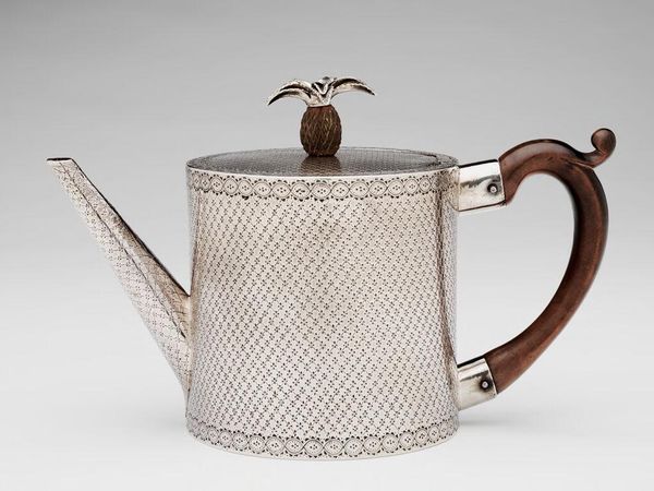 Curator: Let’s discuss this striking teapot by Thomas Whipham, dating back to the 18th century. It’s currently held in the Harvard Art Museums collection. Editor: Immediately, I notice its stark geometric form—a perfect cylinder meeting a sharp, angular spout. It exudes an almost austere elegance. Curator: Tea, of course, became central to trade and colonial power. Objects such as this teapot became signifiers of wealth but also of cultural exchange, both forced and desired, between Europe and Asia. Editor: That contrast between the cool, reflective silver and the warm, organic wood handle—it's a study in textures and temperatures. The maker's careful consideration of materials elevates its simple shape. Curator: Absolutely. The silver speaks to a specific social class and the rituals of tea drinking, and the wood, perhaps, to a connection to the natural world, even if carefully curated. Editor: Seeing it this way, beyond mere function, reveals its potential to spark deeper considerations of class, colonialism, and the role of objects in cultural exchange. Curator: Indeed, and for me, its presence here today invites us to continue these conversations.