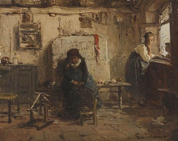 Curator: Welcome. Here we have Gerolamo Induno's 1871 painting, "The Merchant of Sacred Images". It captures a fascinating intersection of commerce and piety within a domestic sphere in Italy. Editor: My immediate impression is of a theatrical tableau—a sense of drama heightened by the intense concentration on the peddler's wares. Note the almost Caravaggesque contrast between the light and shadows! Curator: Yes, and that lighting emphasizes the socio-economic dynamic at play. This image speaks to the era's pervasive religious culture and how it intersected with daily commerce, especially amongst the working class. It highlights how sacred imagery served as a commodity within their homes. Editor: I'm also drawn to the artist’s masterful use of color to direct our eye. Observe how the subdued earth tones of the interior give way to the brighter colors worn by the figures, effectively focusing our attention on their interaction with the religious objects. Curator: Induno was quite invested in depicting everyday life of ordinary Italians in the mid-19th century. Consider how the crumbling plaster and worn wooden beams serve to ground the scene in material reality, countering any idealization of faith. The merchant, he becomes part of the family for the moment. Editor: And yet, the composition directs the gaze in such a way to find a narrative hierarchy—from the contemplative mother and child on the left, to the animated group surrounding the table, up towards the figure on the staircase. A compelling visual cadence. Curator: Exactly, you begin to decode the rituals within the frame. Beyond the composition, though, the painting shows a period grappling with tradition and modernity; Induno situates himself squarely within the project of depicting and therefore solidifying a cohesive national culture for Italy. Editor: Looking again, I find my eyes caught between the merchant’s focused demeanor and the figures clamoring to view his art—their faces illuminated by reflected light, mirroring the inner light of devotion, maybe? What this adds is a layer to our understanding of color and composition. Curator: A telling connection. Reflecting on it now, Induno provides us with not just a scene, but a lens through which to consider the cultural and economic realities of his time. Editor: Agreed. A painting that prompts multiple viewings, with endless structural possibilities of interpretation, it lingers in your thoughts long after you've moved on.